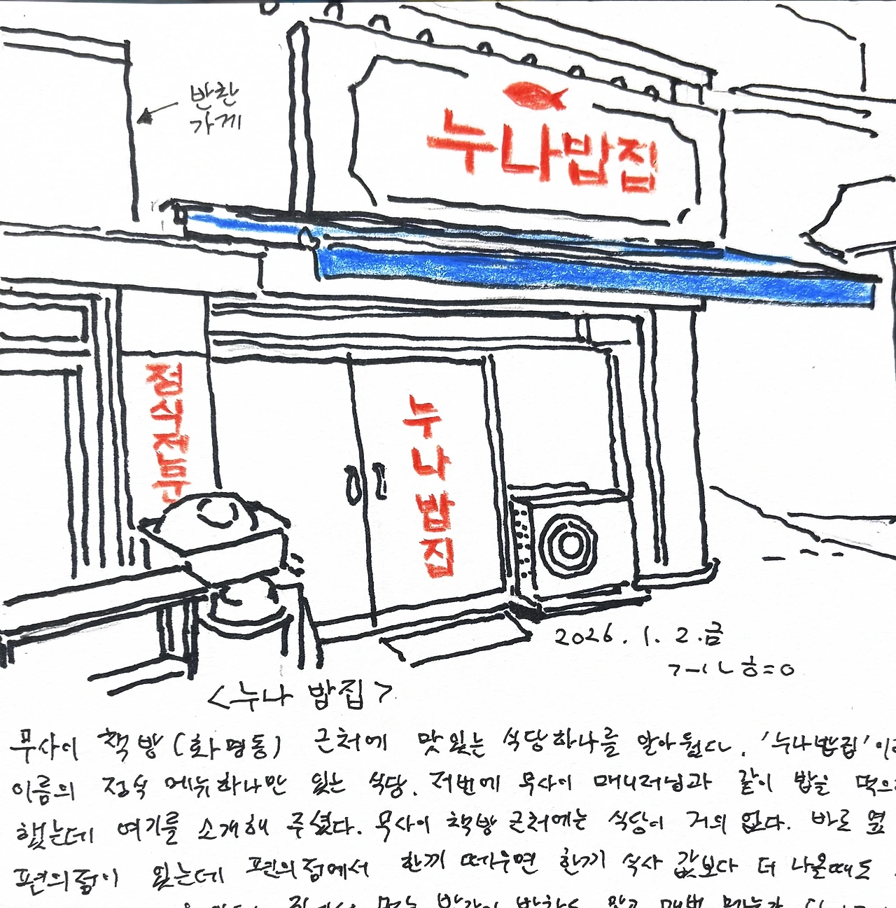 무사이 책방(화명동) 근처에 맛있는 식당하나를 알아뒀다. ‘누나밥집’이라는 이름의 정식 메뉴하나만 있는 식당. 저번에 무사이 매니저님과 같이 밥을 먹으려고 했는데 여기를 소개해 주셨다. 무사이 책방근처에는 식당이 거의 없다. 바로 옆에 편의점이 있는데 편의점에서 한끼 떼우면 한끼 식사 값보다 더 나올때도 있다. 가격이 9000원인데 집에서 먹는 밥같이 반찬도 많고 매번 메뉴가 달라진다. 저번에도 두 공기 먹었는데, 이번에도 두공기를 먹었다. 누나밥집 바로 옆에는 반찬가게인데 어머님이 하시고, 누나밥집은 따님이 하시는 아주 작은 가게. 누나밥집에 왔는데 사장님이 없으면 바로 옆 반찬가게에 가서 찾으면 된다고 한다. 평일만 하고 토요일은 분식을 하신다 한다. 식사를 하고 있으니 어르신들 두 분이 들어오셔서 식사를 하신다. 자주 오시는 분들인 모양이다. 고기 반찬도 있었지만, 나는 김과 간장이 밥도둑이었다. 매번 무사이에 가면 남양산IC 옆 맥도날드에서 먹고 가곤 했는데, 이제 평일날 가게 되면 무조건 누나밥집이다. 식사를 맛있게 하고 숭늉을 마시고 커피한잔을 했다. 사장님께 새해 인사드리고, 어르신 두분에게도 새해에 건강하시라고 말씀드리고 나왔다.