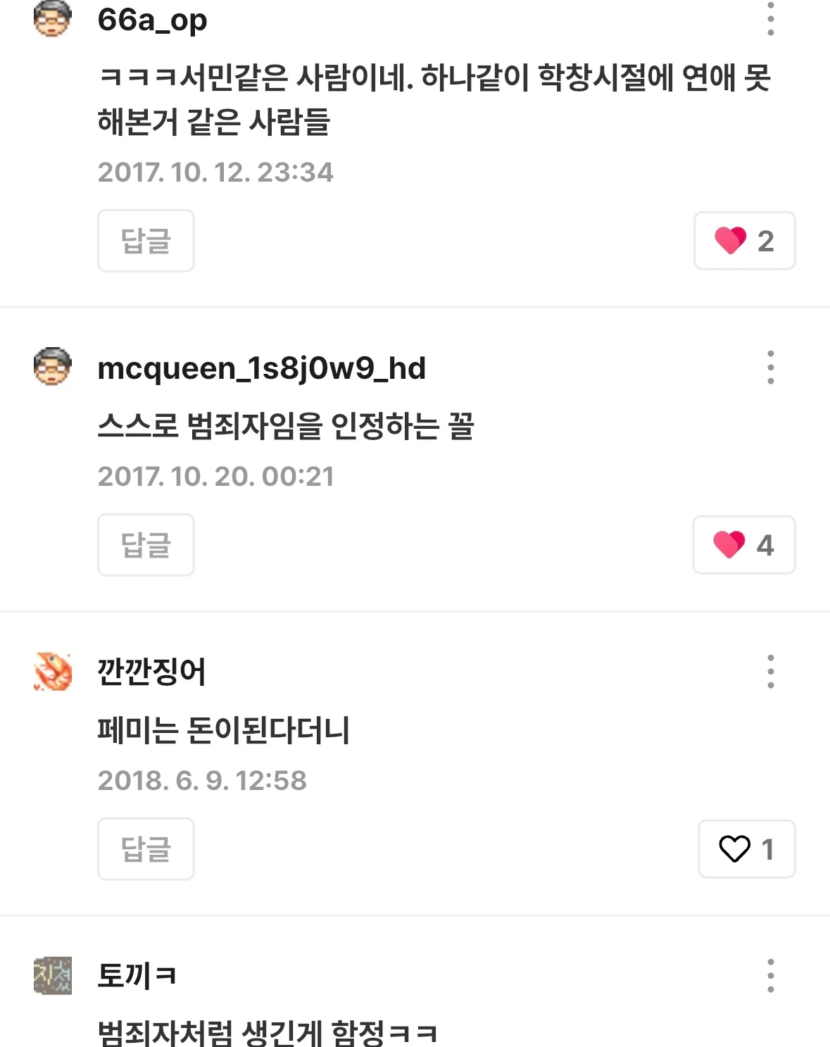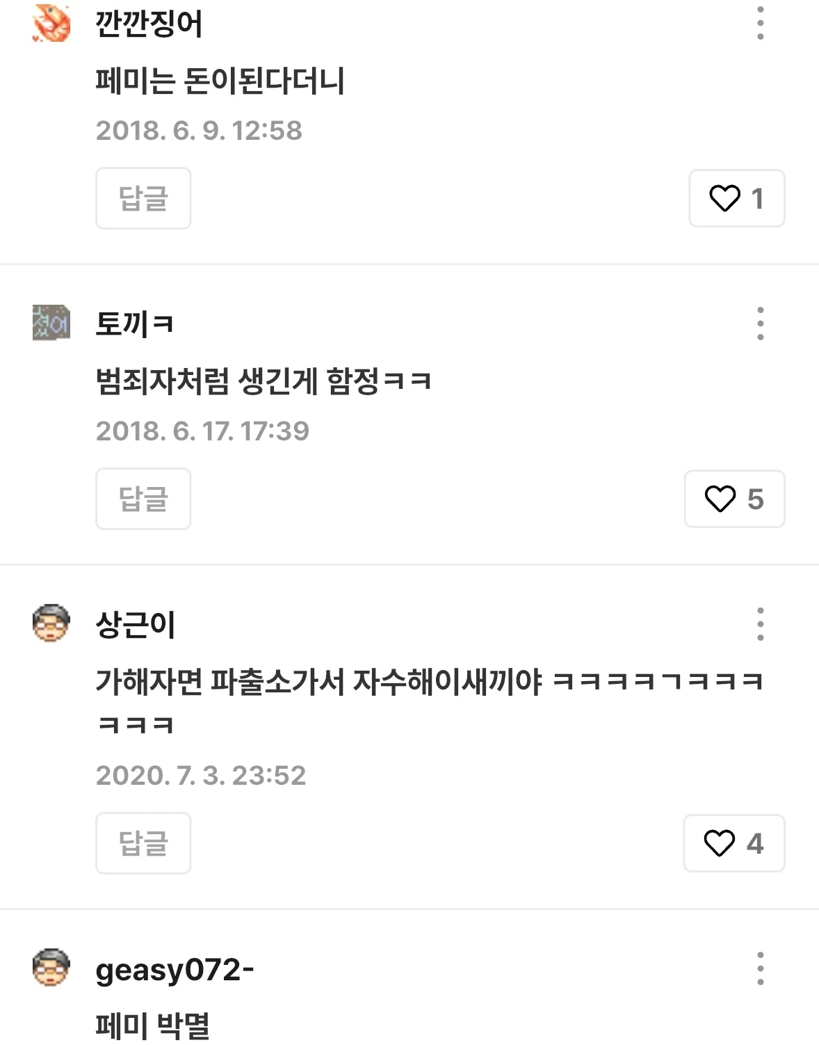 블로그에 잠재적 가해자 검색을 하니 내가 2016년에 인증한 사진과 글이 있다. 거기에도 혐오 댓글이 좀 달려있길래 그것들도 캡쳐를 했다. 한국사회에서 여성을 대상화하고 혐오하는 문화가 만연한 사회에서 남성은 가해자가 될 개연성이 높다는 의미에서 “저는 잠재적 가해자” 입니다라는 말을 한 것이다. 여성이 한국사회를 살아가는 것이 불안하지 않게 사회를 바꾸자는 운동인 것이다. 매일 여성이 폭력을 당하고 살해당하는 뉴스가 도배되는 사회속에서 여성이 밤거리를 혼자 걸으면 두려움을 느끼지 않을까? 나는 남성으로서 이런 사회에 책임은 없는 것일까? 남성들끼리 여성을 대상화해서 음담패설을 나눌때 나는 거기 끼지 않았는가? 아니면 그 남성사회에서 왕따 당할까봐 조용히 묵인하지 않았는가 우리 스스로에게 물어봤으면 싶다. 여성을 대상으로 한 혐오와 폭력, 살인 사건 사건 가해자의 대부분이 남성이라면 나는 가해자가 아니야 하고 발뺌을 할 것이 아니라 그 남성들이 그렇게 해도 별 피해를 입지 않는 세상을 방관한 남성으로서 미안하고 부끄러워하고 뭔가를 하려고 해야하는거 아닐까 싶은 것이다. 한국 성산업의 규모가 30조에 달한다고 하는데, 성매매 업소나 유흥업소에 가보지 않은 남성 없는 것 같고, 혹시나 가지 않았더라도 남성들의 성매매와 유흥문화를 가만히 보고 있는 우리 자신은 책임이 없을까 묻고 싶은 것이다. 나만 안했다고 발뺌하고 저들과는 달라하고 혼자 고고한 척 하는 것이 나는 좀 쪽팔리고 부끄러운 일로 느껴진다. 조주빈만 처벌하면 끝일까? 그 텔레그램방에 가입한 20만명의 사람들은 처벌받지 않다보니(가입하는 조건이 까다롭고 여성혐오적인 영상이나 사진을 올리고 많은 비용을 지불해야 들어갈수 있는 방이다) 또 다른 N번방이 계속해서 생겨나고 있는 것이다.
