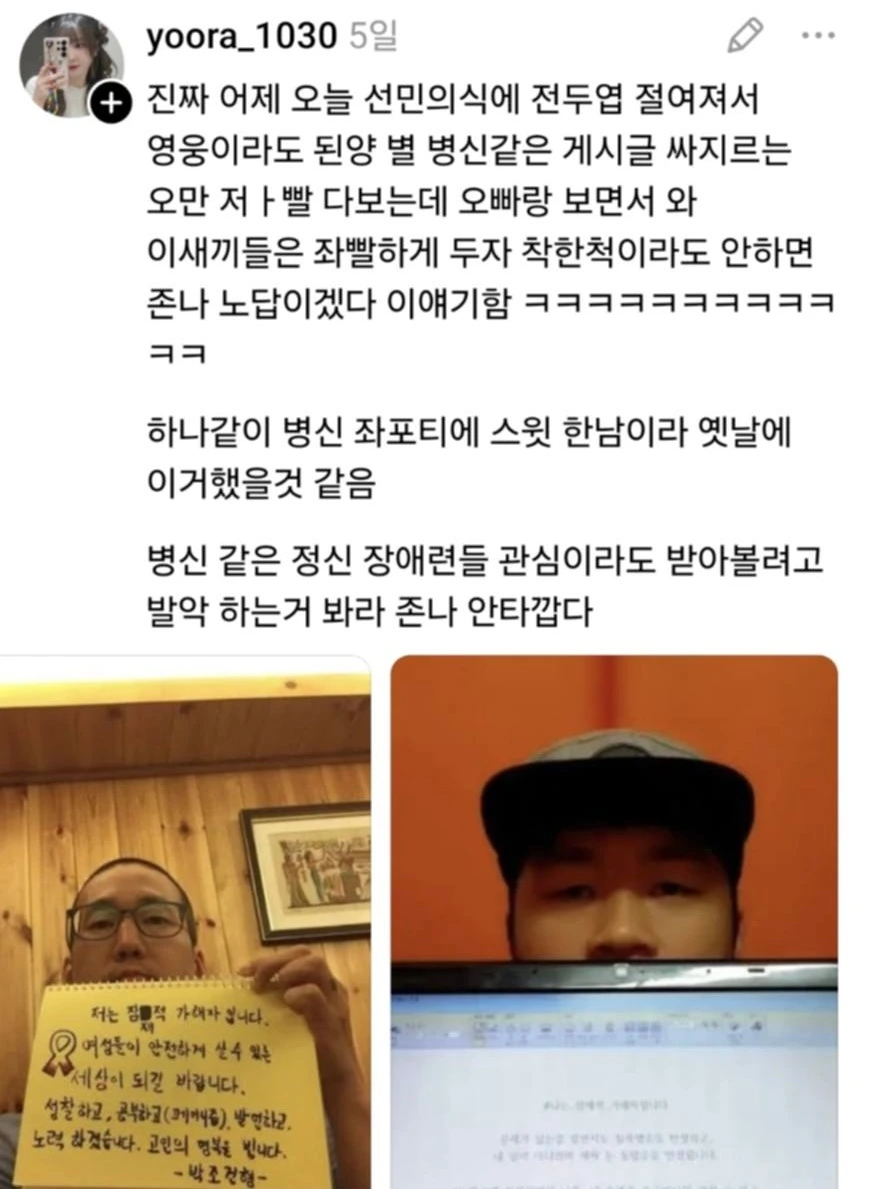 2016년에 운동차원에서 “저는 잠재적 가해자 입니다” 라고 종이에 쓰고 인증한 사진을 블로그에 올렸었다. 어제 디엠으로 정유라 라는 사람이(이 사람 실명 아닐것 같고 프로필에 여자 사진 올려놨지만 왠지 남성일것 같음) 이상한 글 올렸다고 고소하시라며 알려주시길래 박제할겸 글로 기록해 남긴다. 그런 사람이 올리는 이상한 글, 전혀 관심도 없고 화도 안나는데, 선민의식은 왜 나오는지, 좌빨은 왜 나오는지 당최 이해를 할 수 없는 혐오의 글이다. 그 사람 쓰레드의 들어가보니 전부 혐오의 글들만 도배되어 있다.