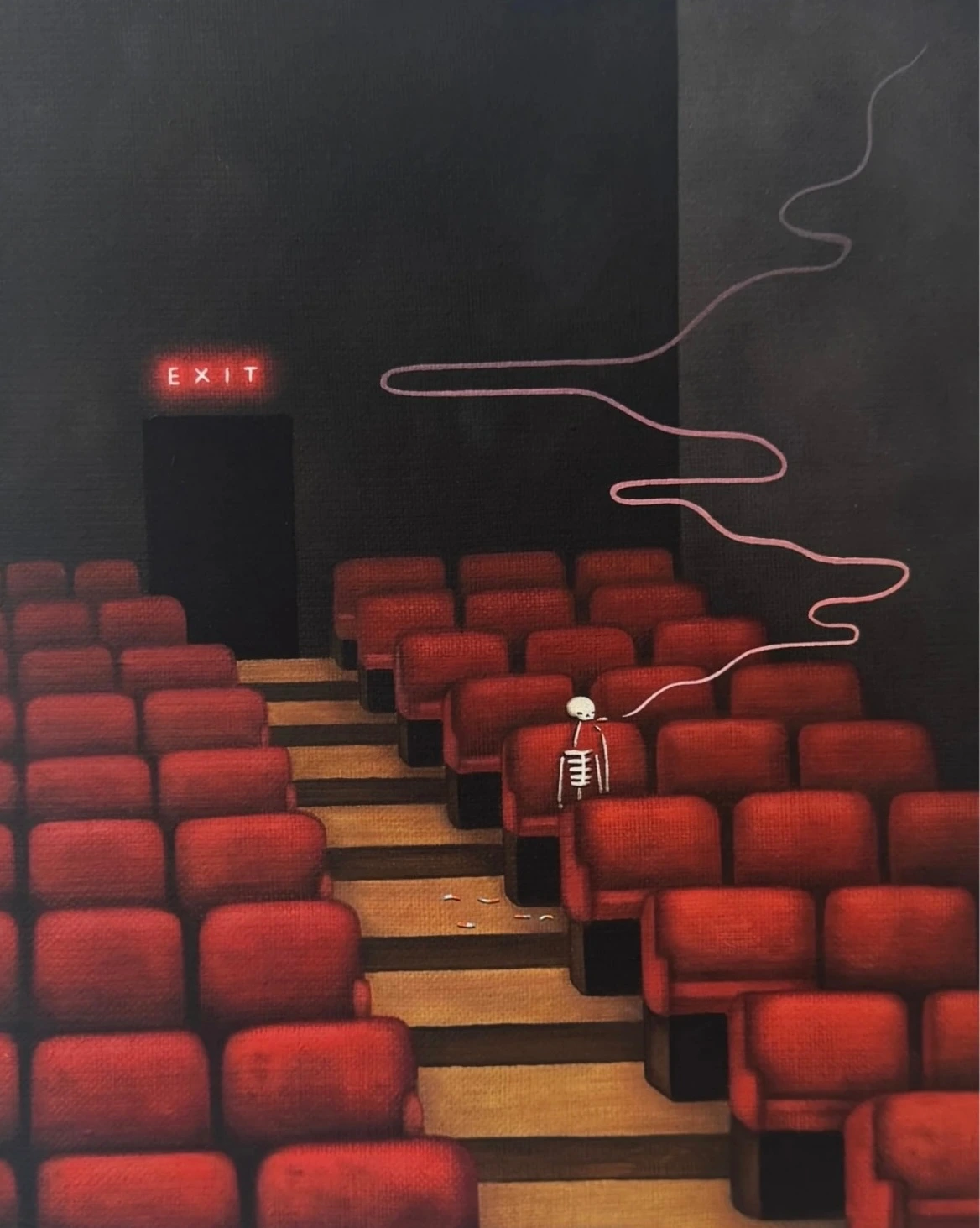 영화관에서 한 사람이 혼자 앉아 담배를 피운다. 나도 타인에게 피해를 주는 것은 좋아하지 않는다. 실제 상황에서 영화관에서 담배를 피면 그 냄새가 영화관 쇼파와 영화과에 배이기에 하지 말하야 하는 행동이긴 하지만, 그래도 이 그림속에서는 작은 일탈로서 허용해 보려고 한다. 나도 가끔 작은 쓰레기 같은 것을 버리면서 해방감을 느낀다. 물론 대자연이나 아주 깨끗한 곳에서는 그 공간이나 자연에 결례가 될까봐 그러진 못하고 지저분한 도심에서 작은 휴지나 작은 과자봉지를 버려본 적은 있다. 그냥 나에게 허용하는 작은 일탈. 내가 너무 도덕적인 재단으로 거기에 갖혀서 날 욱여 넣고 싶지는 않다.