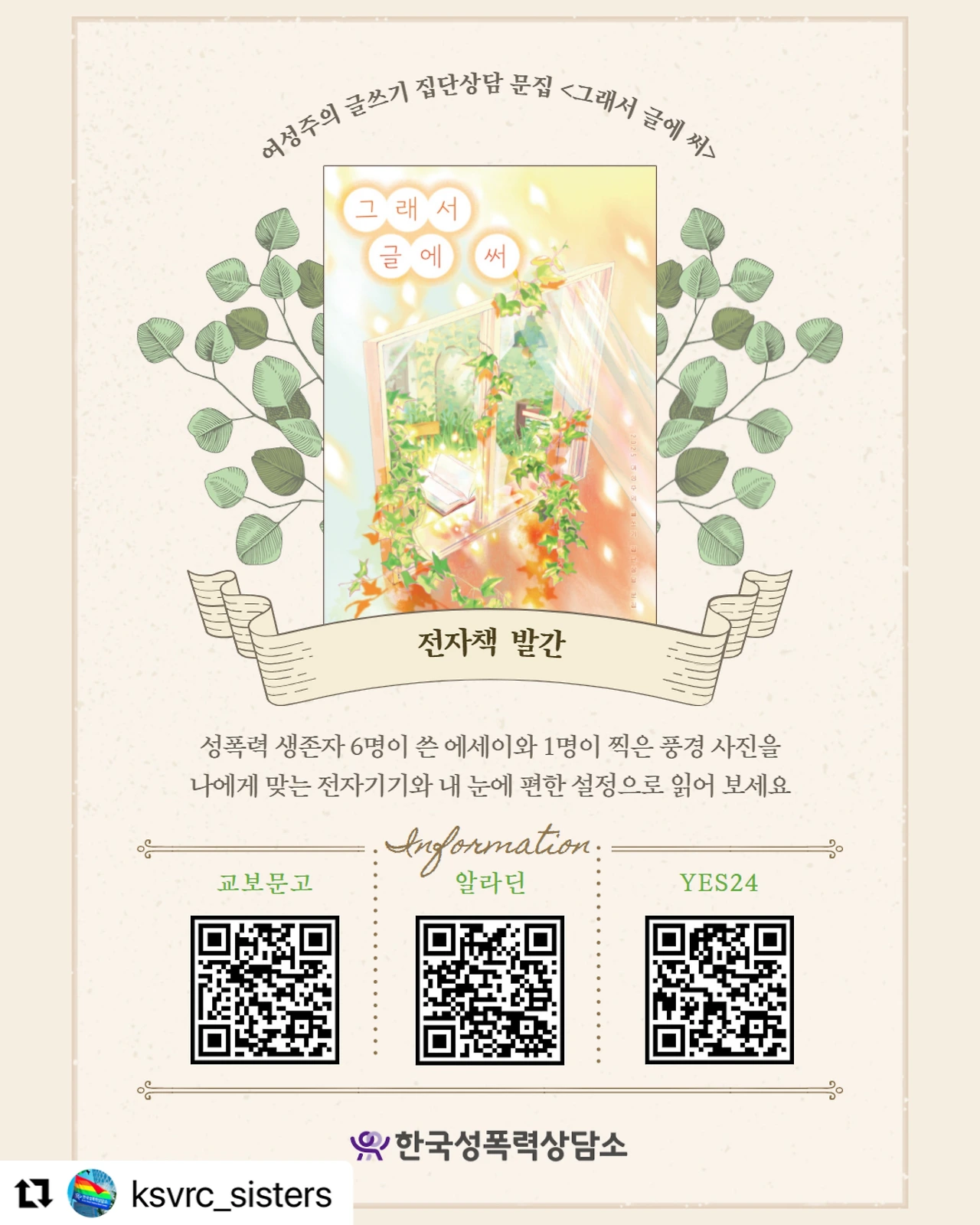 한국성폭력 상담소에서 성폭력 피해 생존자 수기집인 <그래도 글에 써>가 나왔다. e북으로만 읽을수 있는데, 많은 이들이 읽기를 바라는 마음에서인지 무료로 다운 받아볼수 있고 나는 알라딘에서 다운 받았다. 은유 작가님이 프로그램 진행자로 10주간 글쓰기 모임을 이끄셨고 나무, 전경, 푸른나비, 물, 이제야, 밤가을 여섯분의 이야기가 담겨 있다.