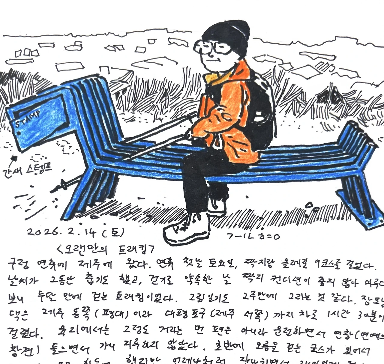 구정 연휴에 제주에 왔다. 연휴 첫날 토요일, 짝지랑 올레길 9코스를 걸었다. 날씨가 그동안 춥기도 했고, 걷기로 약속한 날 짝지 컨디션이 좋지 않아 미루다보니 두달 만에 걷는 트래킹이었다. 그림일기도 2주만에 그리는 것 같다. 장모님댁은 제주 동쪽(평대)이라 대평포구(제주 서쪽)까지 차로 1시간 30분이 걸렸다.육지에서는 그정도 거리는 먼 편은 아니라 운전하면서 연참(연예의 참견) 들으면서 가니 지루하지 않았다. 초반에 오름을 걷는 코스가 있어서 짝지가 조금 힘들어 했지만 언제나처럼 장난치면서 재미있게 걸었다. 12km 코스라 4시간 정도 걷고 언제나처럼 일품순두부 세화점에가서 차돌순두부를 먹었다. 그런데, 명절마다 올레길 걸을때마다 계속먹다보니 이제는 좀 물린는다는 느낌이 들어서 당분간은 음식점 검색해서 먹자고 했다. 집에 돌아오는 길에 집 앞에 있는 ‘다코네 ’빵집에 들렀다. 유명한 빵집겸 카페인데 집 가까이(장모님댁에서 걸어서 100m)있으니 너무 좋다. 사장님 부부는 연휴내내 일하시고 연휴끝나고 쉬신다 했다. 예전에 두분 그림을 그려서 선물을 드린적도 있다. 마감이라며 빵을 하나 더 챙겨주셨다.