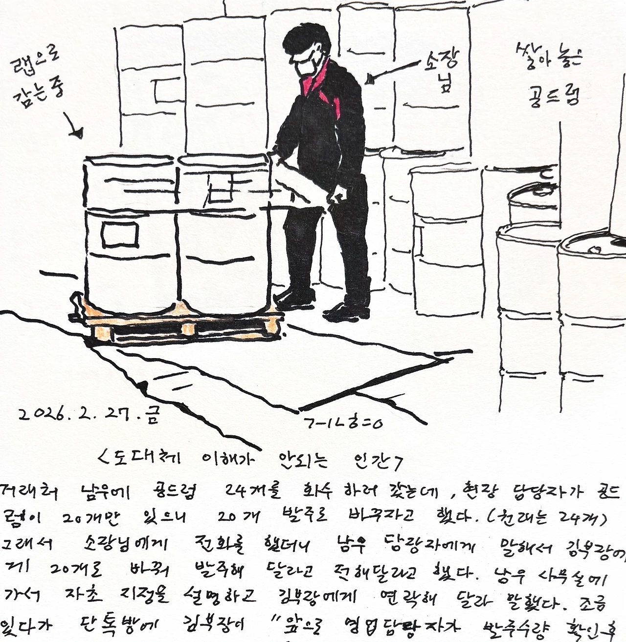 거래처 남우에 공드럼 24개를 회수 하러 갔는데, 현장 담당자가 공드럼이 20개만 있으니 20개 발주로 바꾸자고 했다.(원래는 24개) 그래서 소장님에게 전화를 했더니 남우 담당자에게 말해서 김부장에게 20개로 바꿔 발주해 달라고 전해달라고 했다. 남우 사무실에 가서 자초 지정을 설명하고 김부장에게 연락해 달라 말했다. 조금있다가 단톡방에 김부장이 “앞으로 영업담당자가 발주수량 확인후 발주수정 부탁드립니다” 라고 올린게 아닌가. 아마 남우 사무실에서 차장님에게 전화를 걸었던 것 같고, 김부장은 지를 거치지 않고 20개로 조정된게 맘에 안든 모양이다. 그러면 내가 남우에 갔다왔으니 내게 전화헤서 자초지정을 확인하는 가장 쉬운 방법을 두고 이래저래 돌아서 엉뚱하게 이해하고 삐진 것 같다. 회사에 들어오니 소장님은 전전긍긍하면서 앞으로는 무조건 24개로 받자는 이야기도 했다. 별일도 아닌걸 가지고 왜 사람들이 전전긍긍하는지 짜증도 나고 당최 김부장이라는 인간을 이해할수가 없다. 너무도 유아적인 사람 같아 짜증이 난다. 왜 그 인간 하나 때문에 현장 사람들이 이래저래 눈치를 보는지, 소장님도 왜 전화해서 따지지 않는지 답답할 따름이다. 밥먹고 사는 일이 쉽지 않은 일임을 이렇게 늘 실감한다.