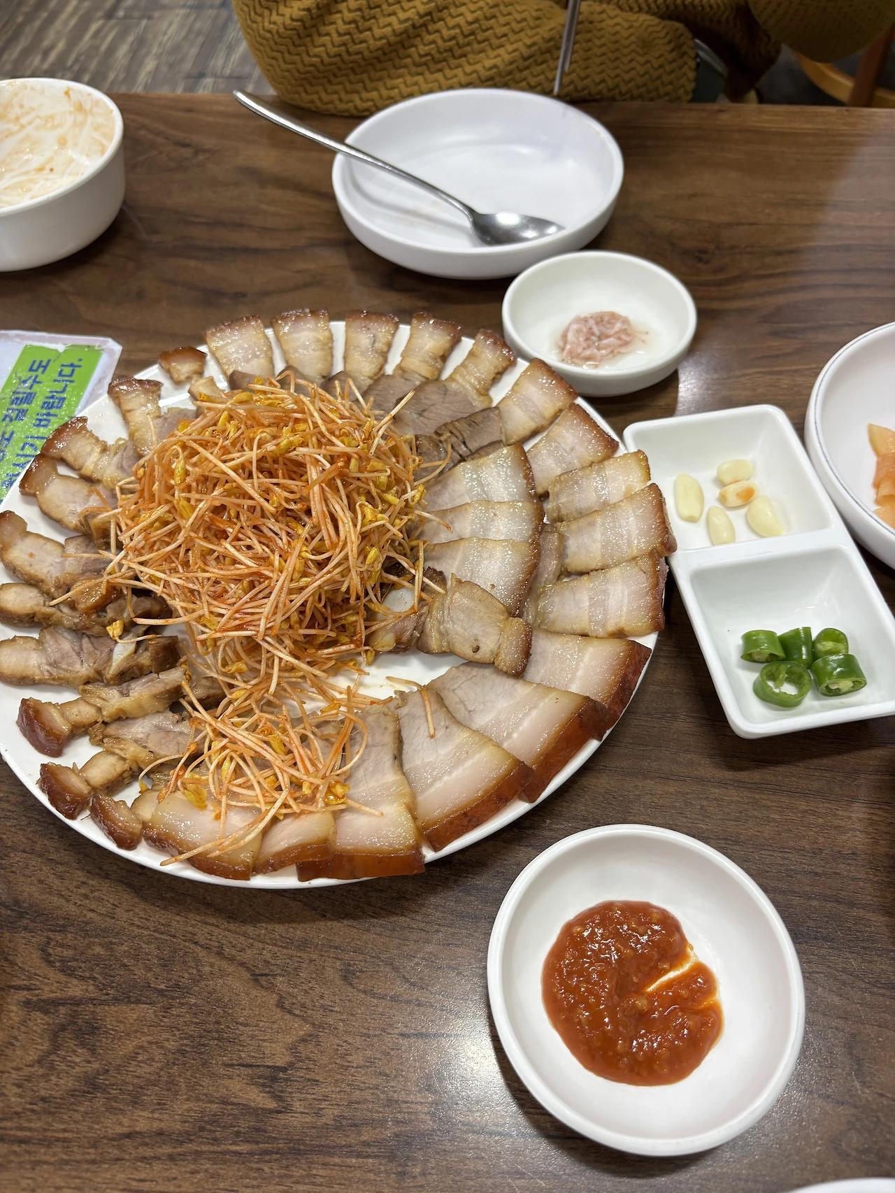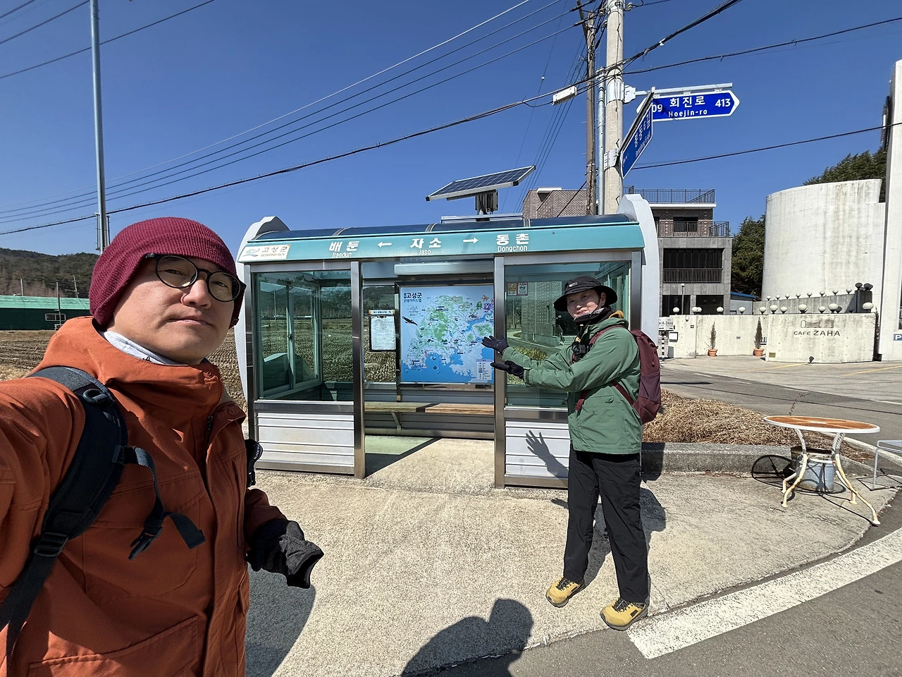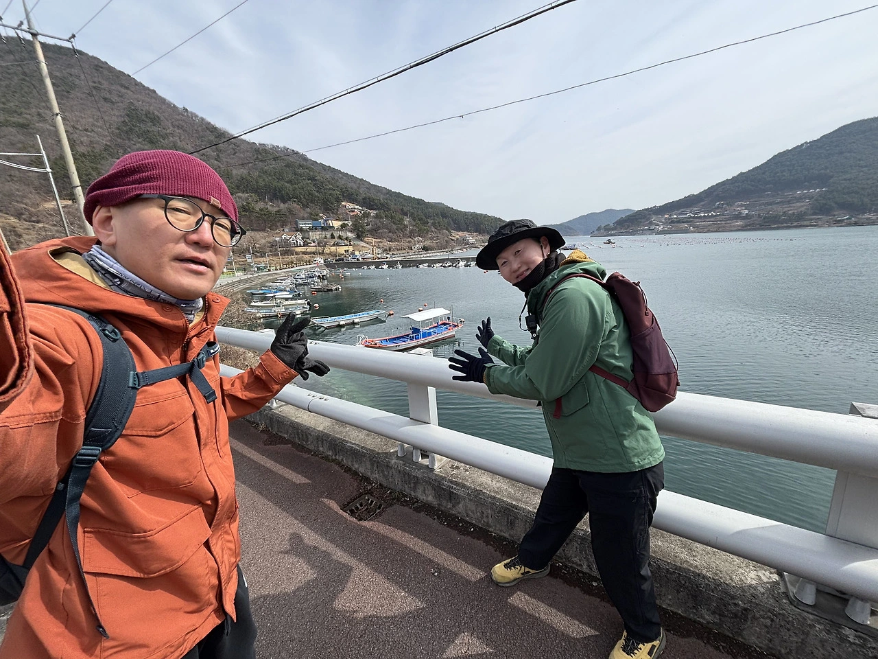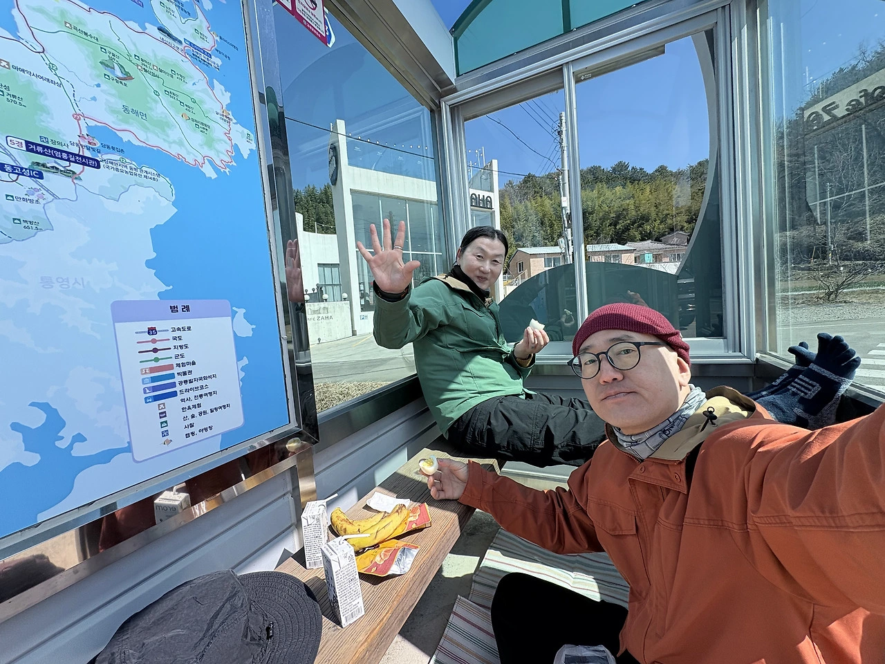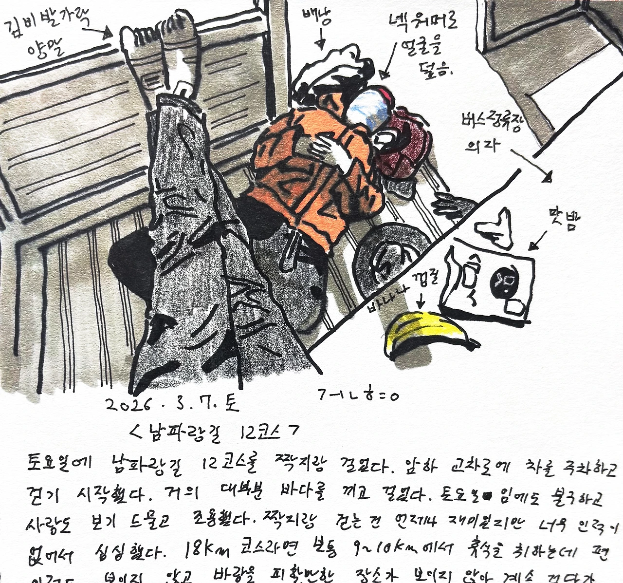 토요일에 남파랑길 12코스를 짝지랑 걸었다. 암하 교차로에 차를 주차하고 걷기 시작했다. 거의 대부분 바다를 끼고 걸었다. 토요일 임에도 불구하고 사람도 보기 드물고 조용했다. 짝지랑 걷는건 언제나 재미있지만 너무 인적이 없어서 심심했다. 18km 코스라면 보통 9~10km에서 휴식을 취하는데 편의점도 보이지 않고 바람을 피할만한 장소가 보이지 않아 계속 걷다가 12km정도 지점, 고성 공룡엑스포공원(?) 바로 맞은편 버스 정류장에서 휴식을 취했다. 바람을 가려주니 쉴만했고 인적이 드문 곳이라 버스정류장에 사람도 오지 않아서 편하게 드러 누워 쉬었다. 휴식을 취할때도 삼각대에 카메라를 켜서 촬영했는데 둘이 뭐가 그리 재미있는지 장난치며 낄낄낄 웃었다.(트래킹 영상은 ‘박조김비’ 채널에 기록하고 있다. ) 평지라서 남은 거리는 1시간만에 후딱 걸었다. 총 4시간 30분 정도 걸었다.(휴식 시간 빼고) 택시타고 암하교차로로 돌아왔다. 예전에 갈맷길 걸을때 단골로 가던 만서리이가네막국수에서 새싹수육 대자와 메밀칼국수를 든든하게 먹었다.