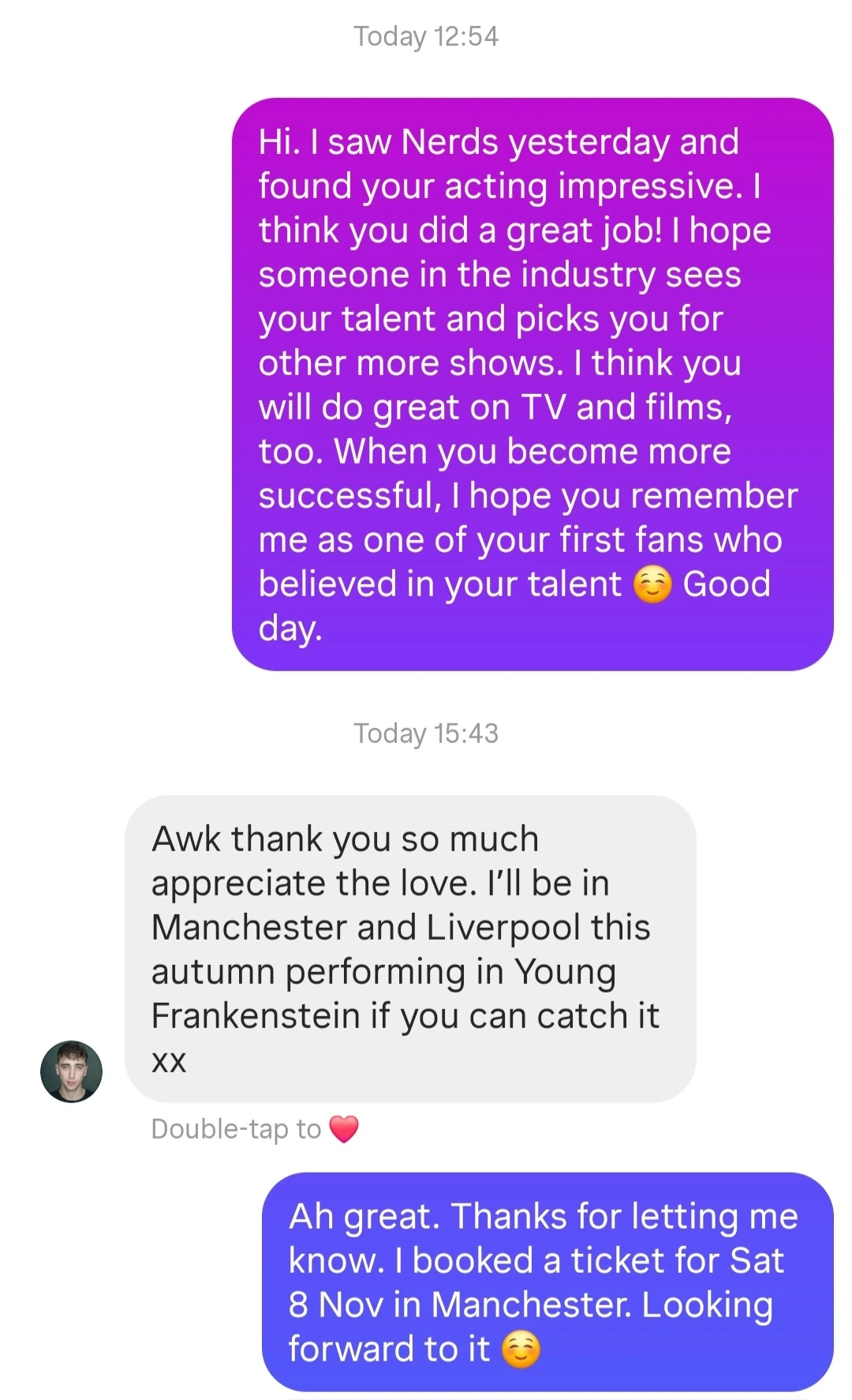 지난여름 7월 25일에 뮤지컬 코미디 너드들 Nerds을 보러 갔다가 (지난 글: https://brunch.co.kr/@8df7531fef574a5/123) 조연 배우 커티스 패트릭 Curtis Patrick에게 감명을 받아 인스타 DM을 보냈었다. 연예인이나 모르는 사람에게 DM 같은 걸 평생 보내본 적이 없었는데 그날은 왠지 되게 그러고 싶었다. 근데 신기하게 제법 금방 답장이 왔고 다음 공연을 알려줘서 먼 맨체스터지만 (울 동네 레스터에서 기차로 2시간 반) 미리 티켓팅을 해놨더랬다.