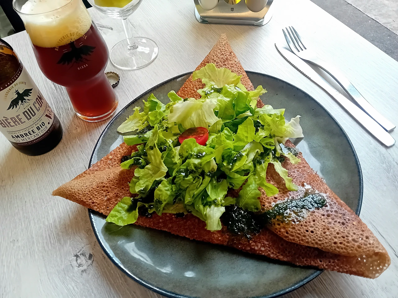 대충 오늘의 관광이 끝난 거 같아서 저녁을 먹으러 갔다. 크레페집에서 갈레트 galette와 프랑스맥주를 시켰다. 아까 점심도 엄청 건강한 느낌이었는데 저녁마저 이렇게 건강하게 나오다니... 갈레트에 샐러드 올려주는 거 처음 봤다. 요새 프랑스 사람들이 아주 건강을 챙기나 보다.
