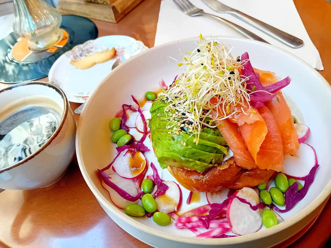 어제 크루아상도 맛있었지만 다른 카페도 가보고 싶어서 새로운 카페 Chez Les Garçons에 가봤다. 식상하지 않은 걸 먹고 싶어서 연어 아보카도 브리오슈를 시켜봤다. 브리오슈 빵을 브런치 메뉴로 만든 거 처음 먹어본다.