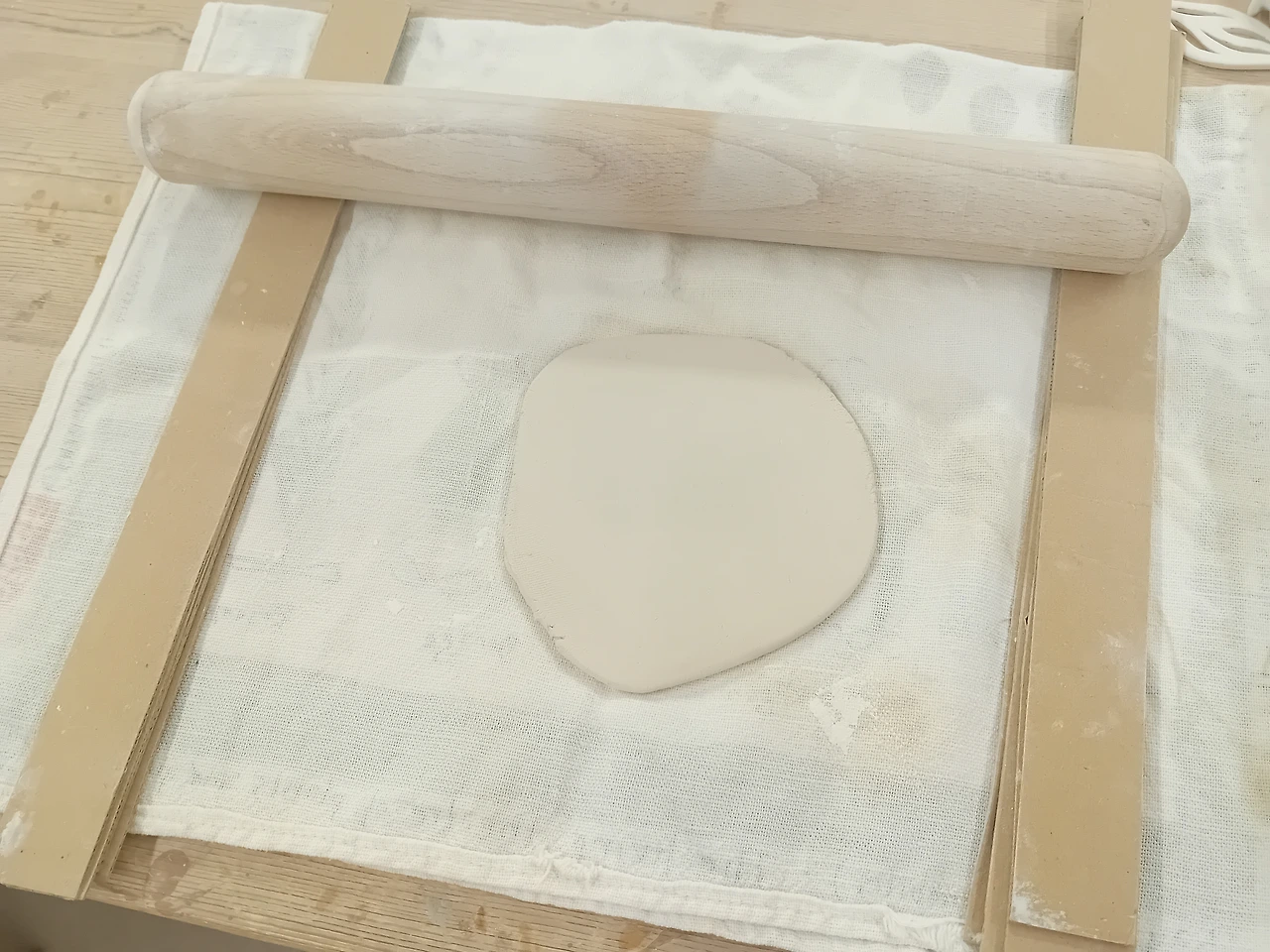 자기 점토를 밀대 rolling pin로 밀어서 납작하게 하는 과정은 다른 도자기랑 똑같았다. 다른 점은 더 두께가 얇아야 하니까 두께 조절대 rolling guide로 나무 막대기가 아니라 종이를 깐다.