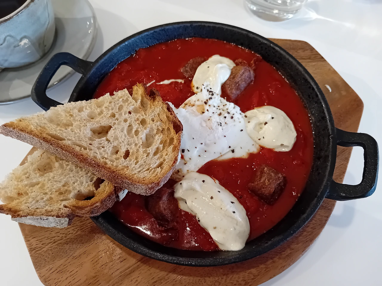 결론적으로, 전혀 대단한 음식은 아니지만 왜 좋아하는지 알 것 같다. 따뜻한 토마토소스, 반숙 계란, 과하지 않고 적절한 향신료, 요거트, 매콤한 킥이 되는 소시지에 겉바속촉 사워도우 sourdough 빵까지 조화가 좋다. 다 몸에 좋을 것 같고, 탄단지 균형이 잡혀있고, 너무 헤비 하지 않은데 그래도 배는 부르고, 아침 혹은 브런치로 매일 먹어도 매일 먹을 수 있는 그런 맛이다. 소시지, 향신료, 빵의 종류를 바꿔가며 먹으면 1년 내내 먹어도 먹을 수 있을 것 같다. 다른 브런치 식당에서도 샥슈카가 보이면 또 시켜 먹어야지.