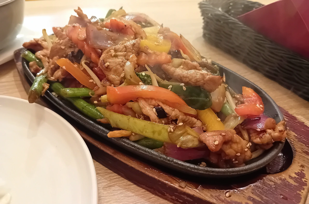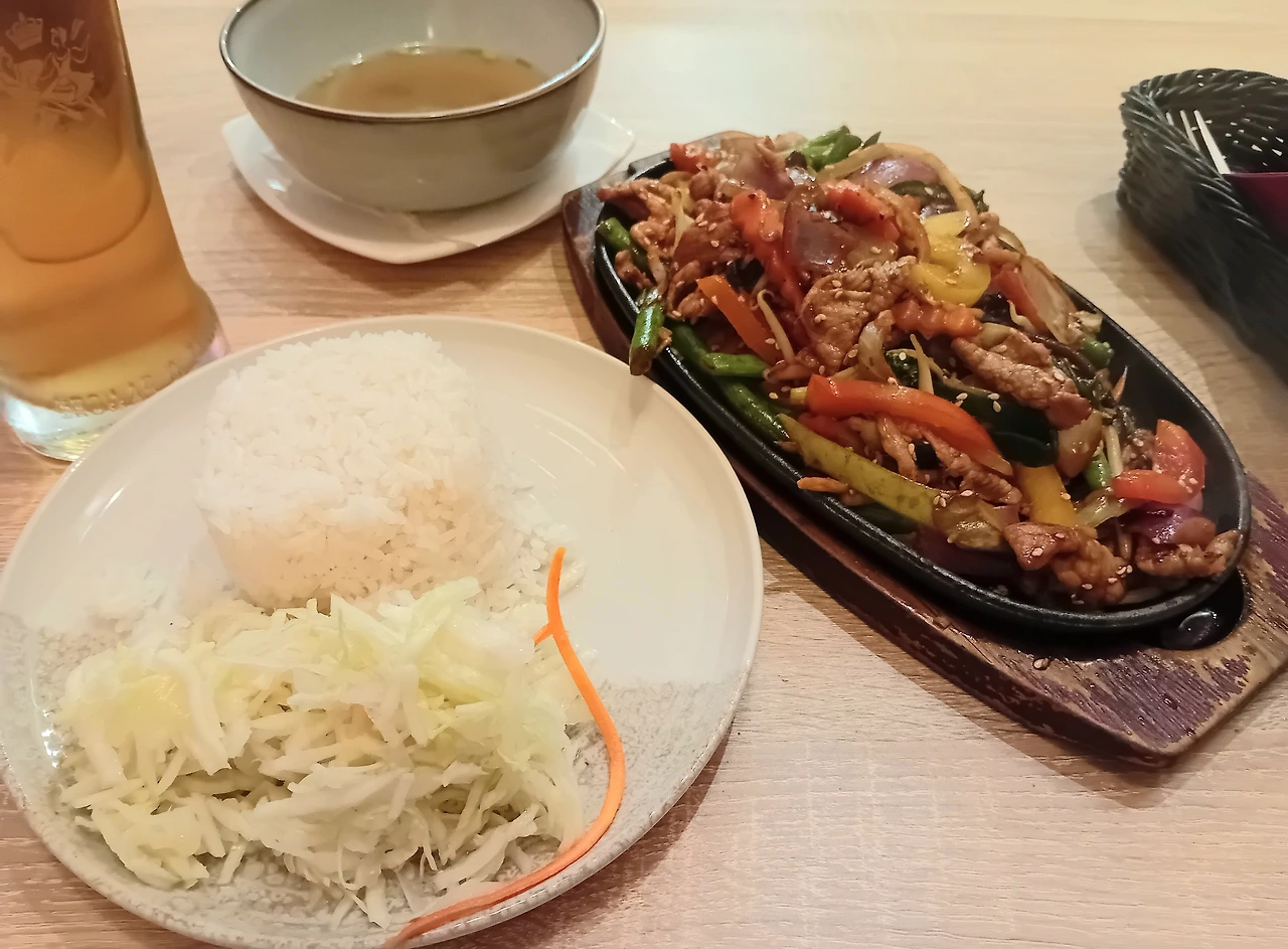 쌀국수를 막 다 먹고 맥주를 홀짝이고 있는데 엄청난 지글거리는 소리를 내며 눈이 매울 정도의 연기를 내뿜는 철판 돼지고기 볶음이 나왔다. 밥이랑 양배추 절임 샐러드도 같이 나왔다. 진짜 베트남 분처럼 보이는 남자 요리사분이 서빙을 해주셨다. 막 먹으려는데 다른 손님이 내가 시킨 거 뭐냐고 물어봐서 알려줬다. 내 뒤로 줄줄이 같은 걸 시키는 것 같았다.