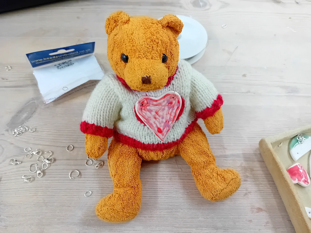 색이 너무 밝고 고와서 차마 걸고 다니기 민망한 자기 조각들 위주로 인형과 장식품들에게 목걸이를 만들어줬다. 제일 크고 핑크핑크한 하트는 노란 곰돌이 목걸이로 만들었다.