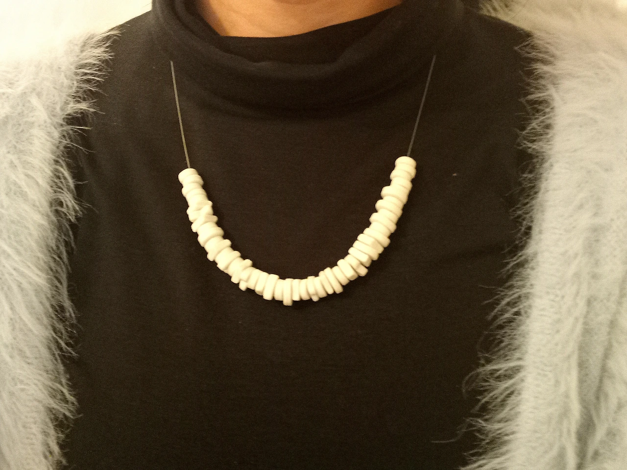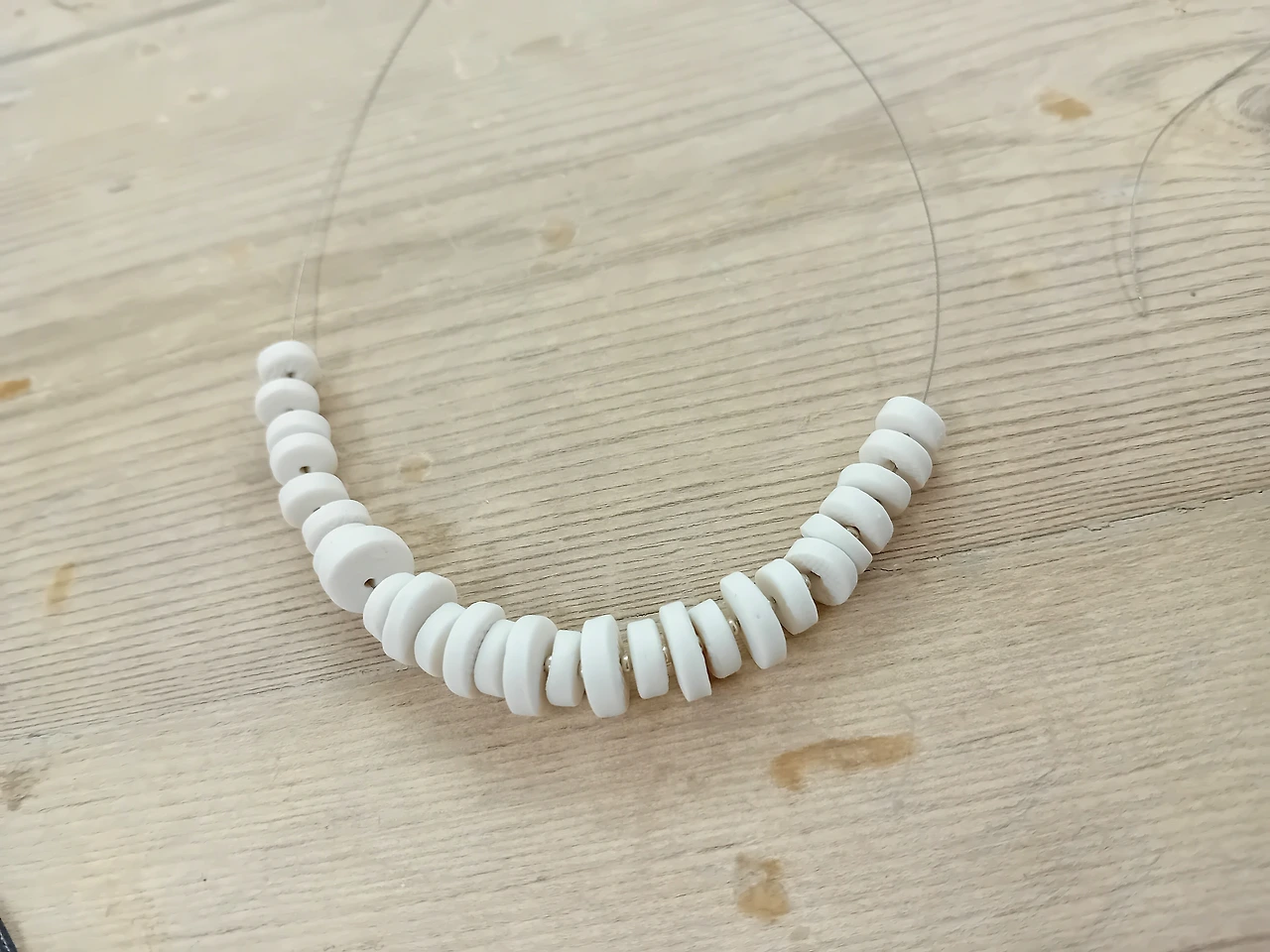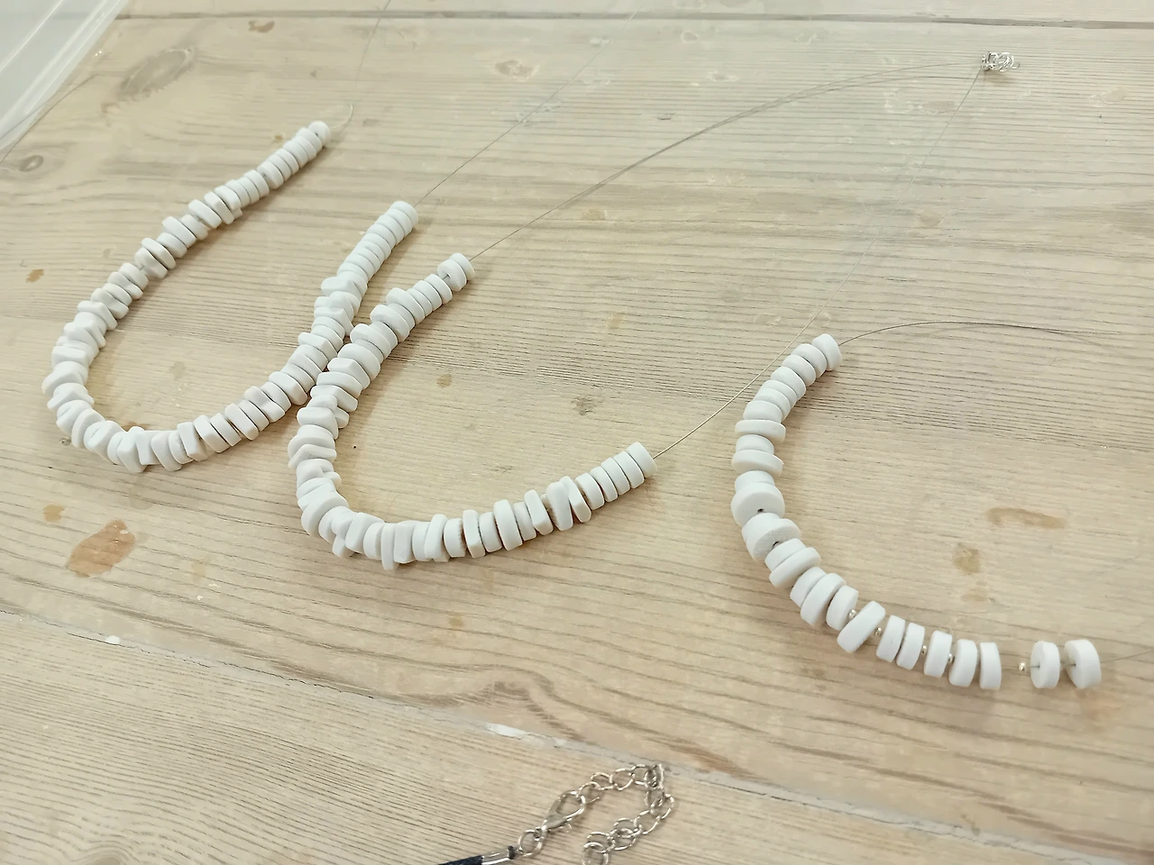 하얗고 납작한 동그라미 비즈들이랑 금속 비즈들을 번갈아 엮어서 목걸이를 하나 만들었다. 나머지는 시간이 없어서 금속 비즈 없이 자기 조각들만 막 끼워 넣어 총 목걸이 세 개를 만들었다.