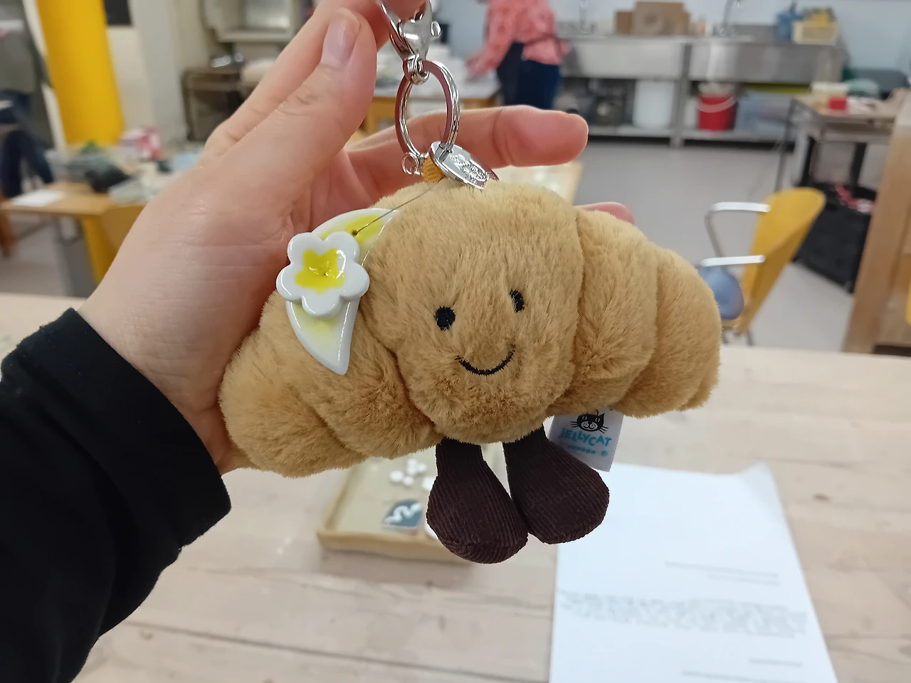 자기 주얼리 마지막 수업에 갔다. 반달에 노란 꽃 붙인 아이는 살짝 크루아상 모양 같아서 크루아상 키링에 같이 달아줬다.