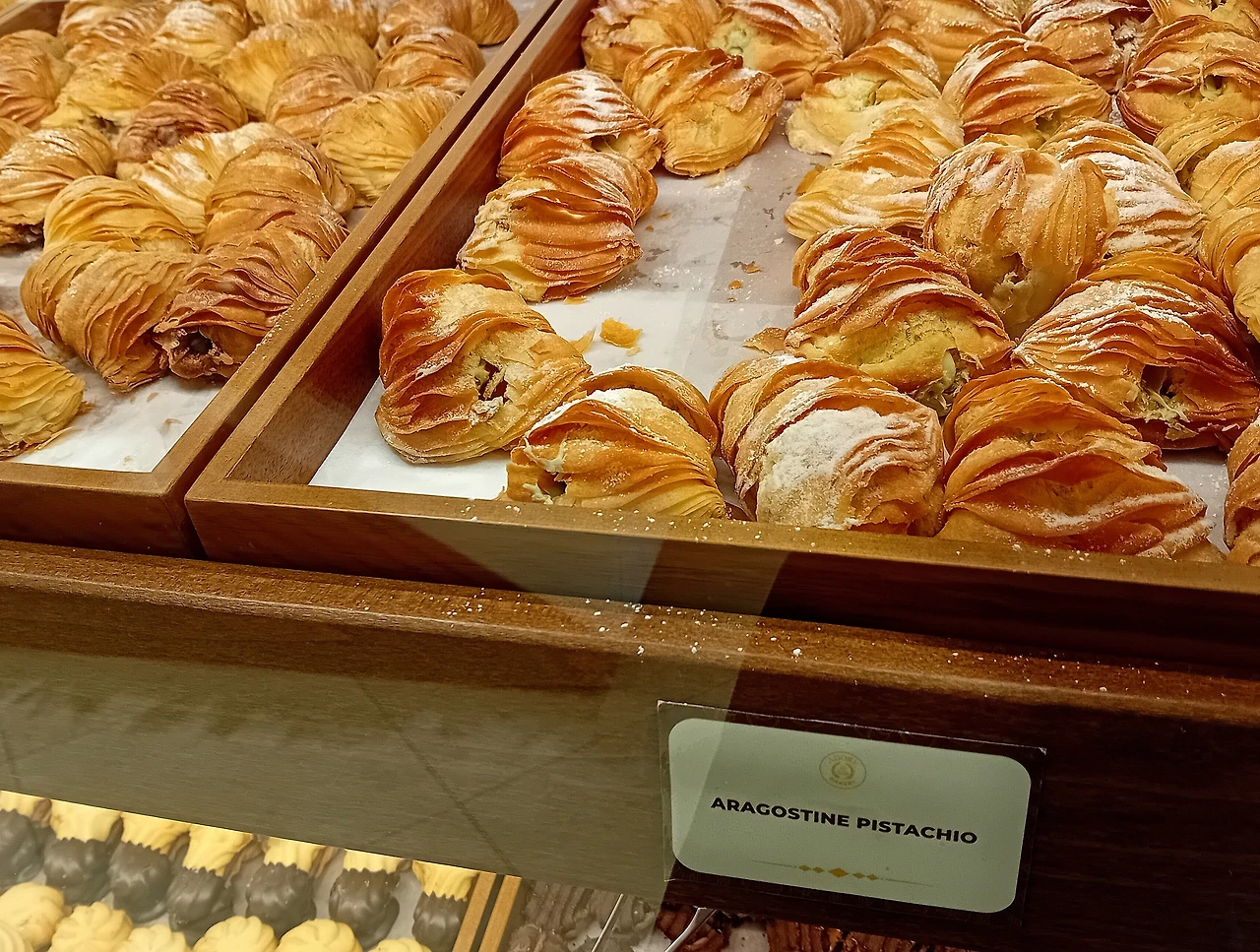 신중하게 고른 아이는 아라고스틴 피스타치오 Aragostine Pistachio였다. 가게 안에 앉을자리가 없어서 포장해서 나왔다. 우리 동네 돌아가는 기차 안에서 먹었는데 진짜 맛있었다. 겉에 페이스트리는 진짜 바삭바삭하고 안에 피스타치오 크림은 부드럽고 고소하고 딱 적당히 기분 좋게 달았다. 다음에도 어디 가서 아라고스틴 피스타치오가 보이면 사 먹어야지.