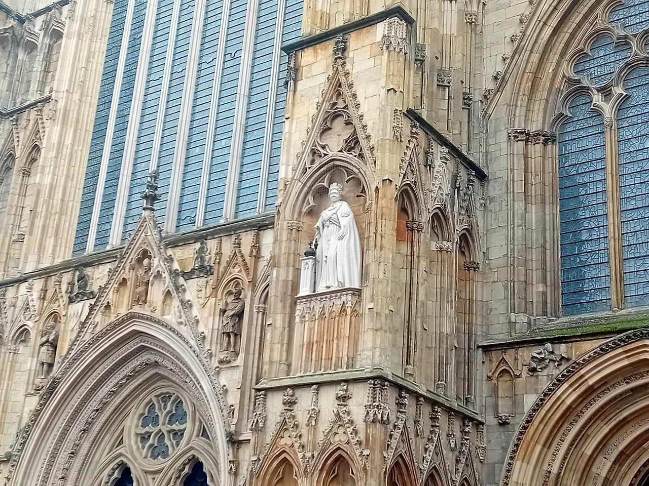 대성당 정면에 엘리자베스 여왕 석재 조각을 세운 지 얼마 안 되었다고 한다. 확실히 엘리자베스 여왕 조각의 돌 색깔만 아주 새것처럼 하얗고 깨끗하다. 500년도 전에 세워진 대성당과 현대 조각의 만남이 그리 낯설지 않다.