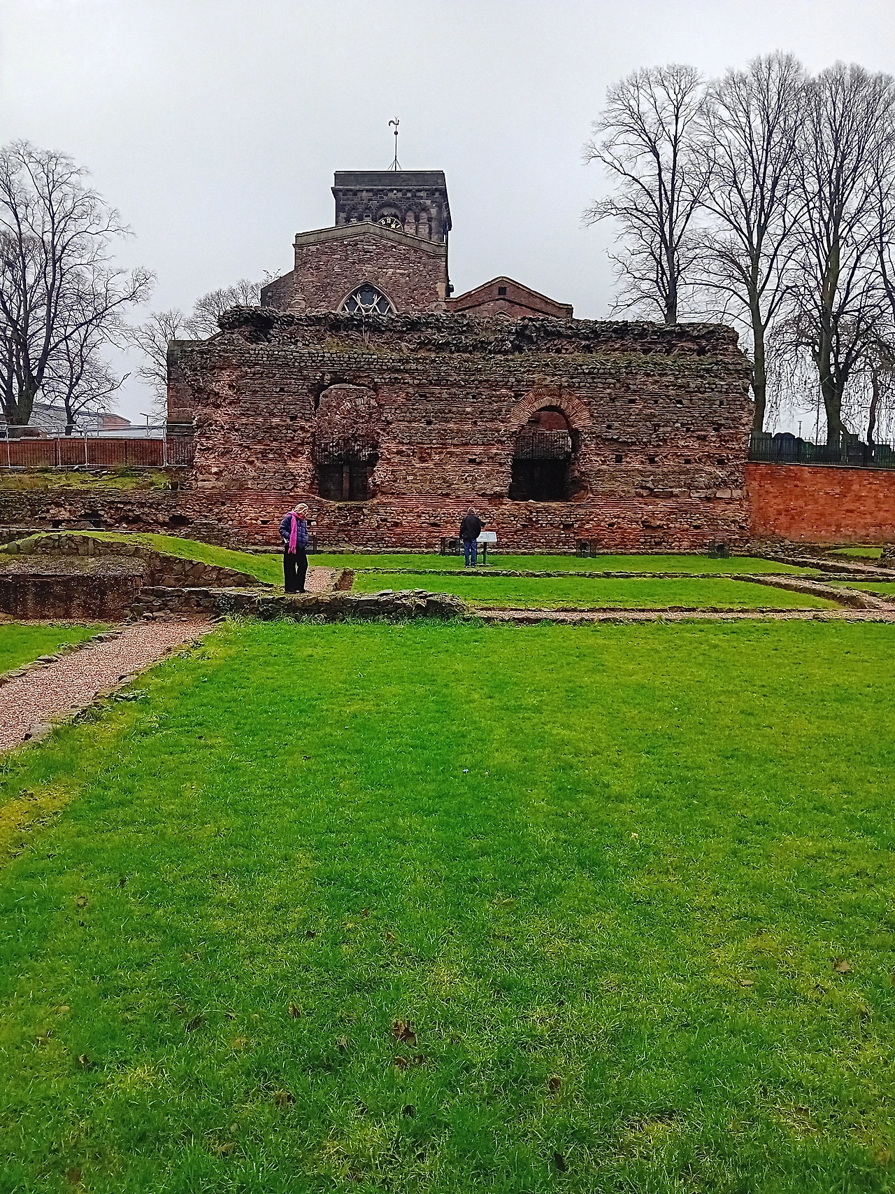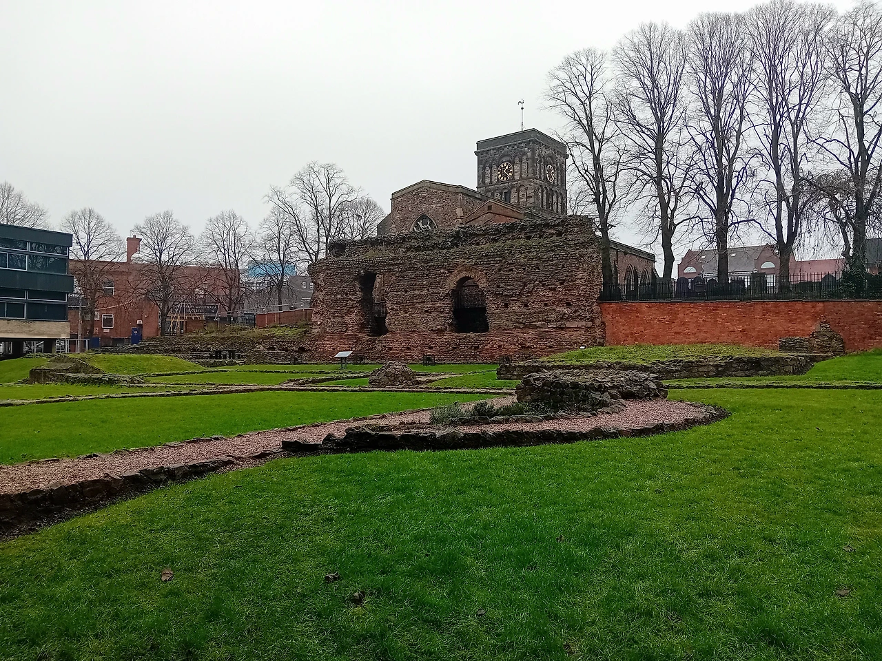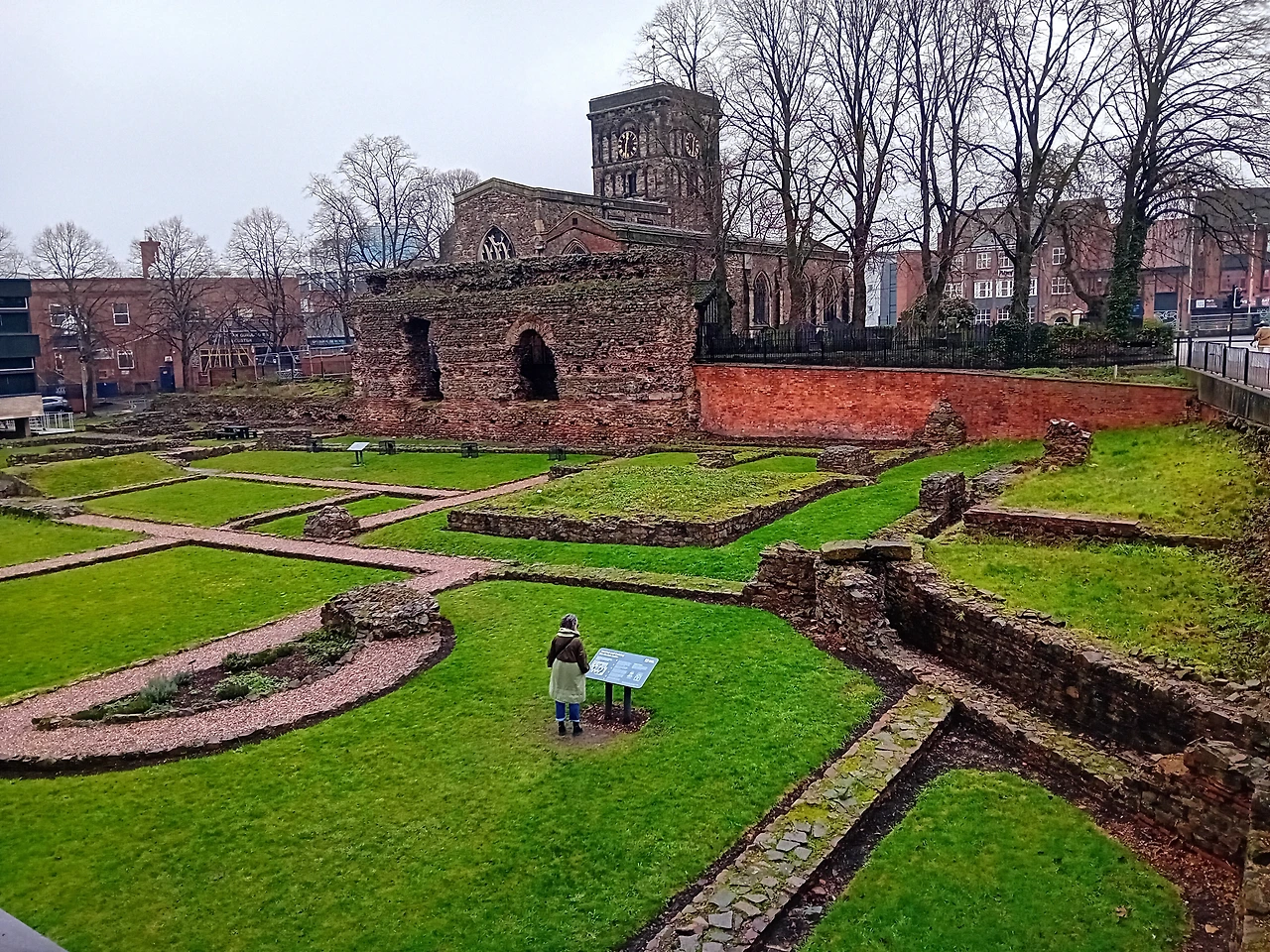 브런치를 먹고 유대인 성벽과 로마 목욕탕 Jewry Wall & Roman Baths에 갔다. 2020년에 레스터로 이사 온 이래 한 번도 문을 연 적이 없었던 곳인데 최근에 문을 열었다. 어떤 곳인가 궁금했는데 마침 손님이 온 김에 같이 구경을 가보니 좋았다. 입구를 찾아 헤메다보니 길에서 유적지가 내려다 보였다.