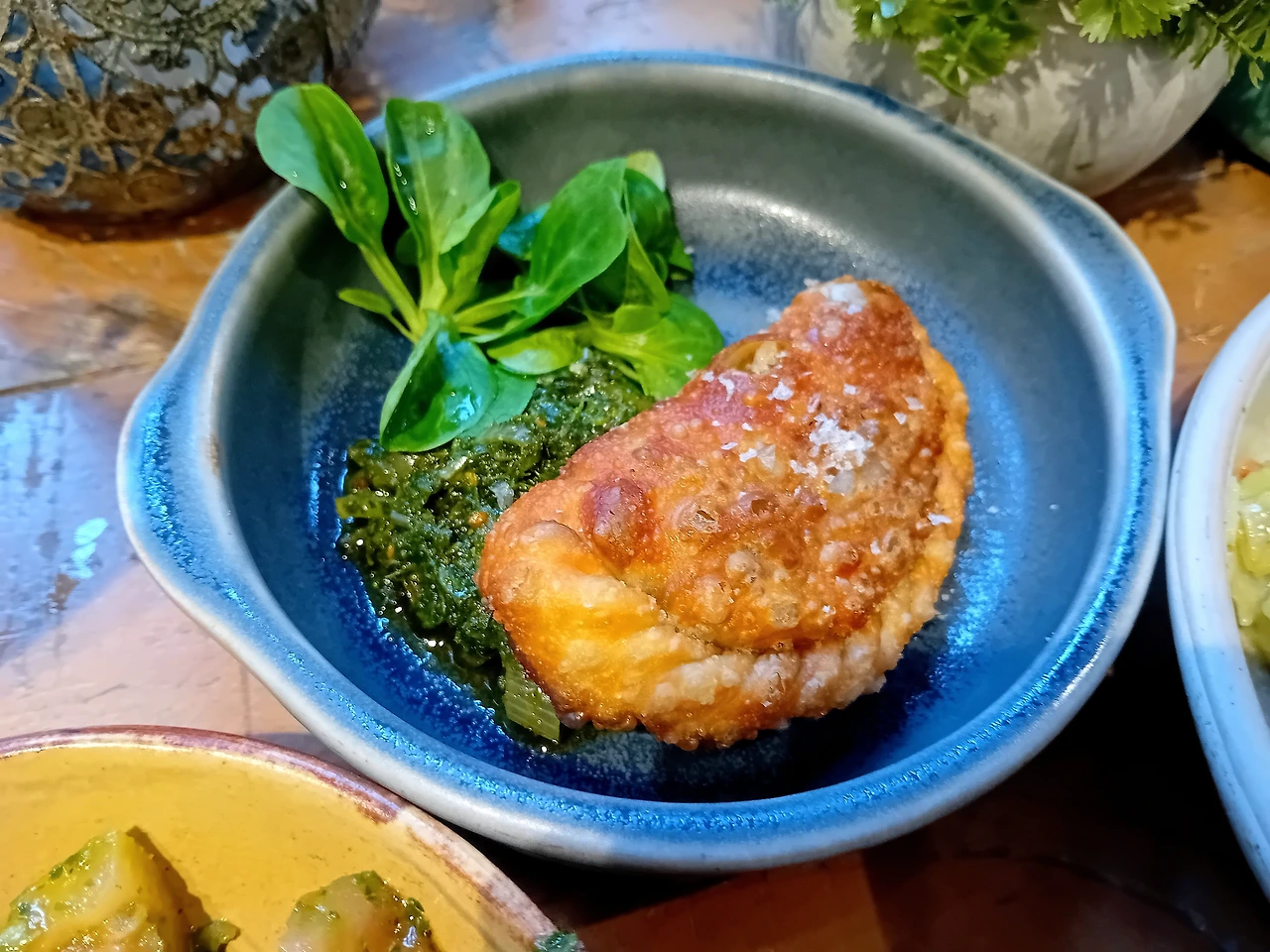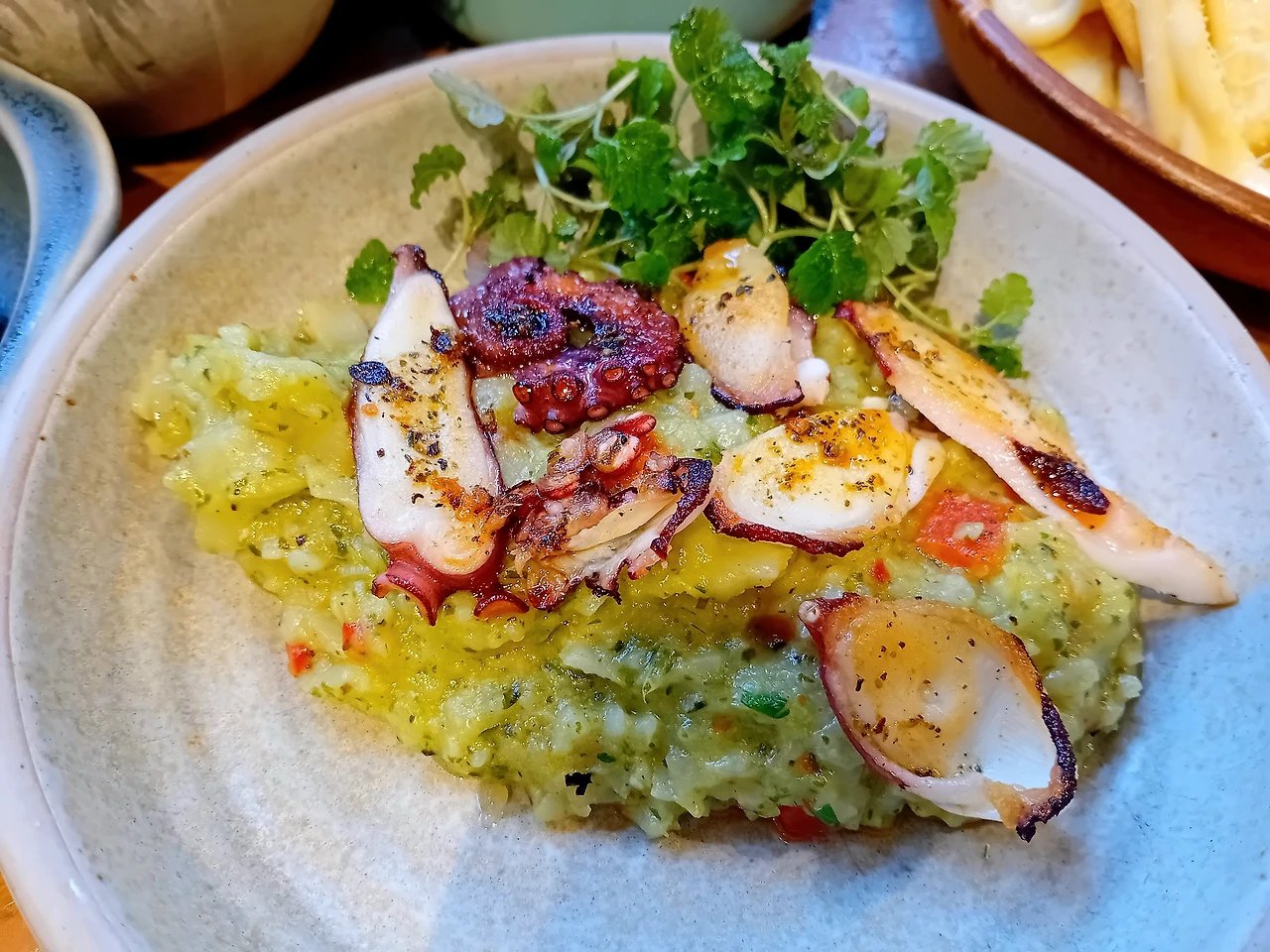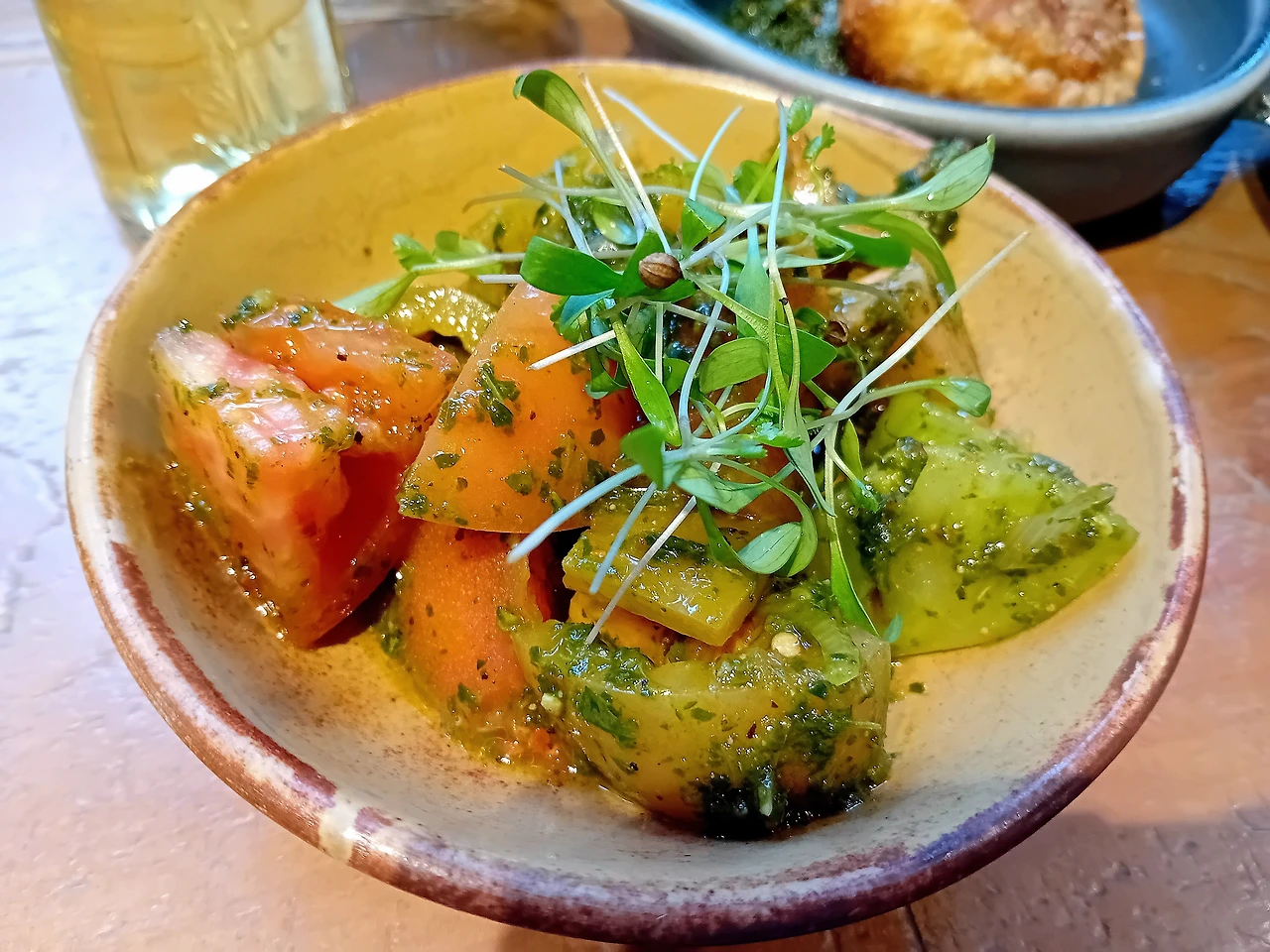 이것저것 다양하게 먹어보고 싶어서 타파스 먹는 느낌으로 스타터 둘과 사이드 하나를 시켰다. 소고기 엠파나다 empanada (스페인/중남미에서 많이 먹는 페이스추리 만두 같은 것), 문어 구이, 토마토 샐러드.