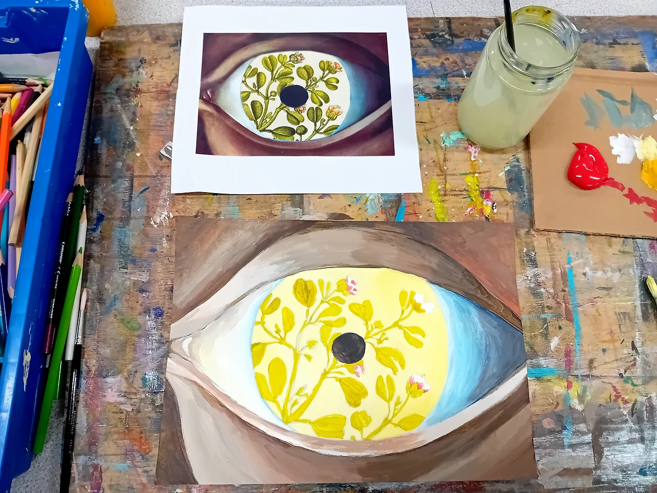 꽃 배경이 되는 홍채를 제일 마지막으로 칠했다. 칠할 때는 몰랐는데 다 칠해놓고 보니 원래 콜라주 그림보다 많이 노랗다는 것을 깨달았다. 뭐 어쩔 수 없고, 이것은 내 그림의 오리지널리티라고 하자.