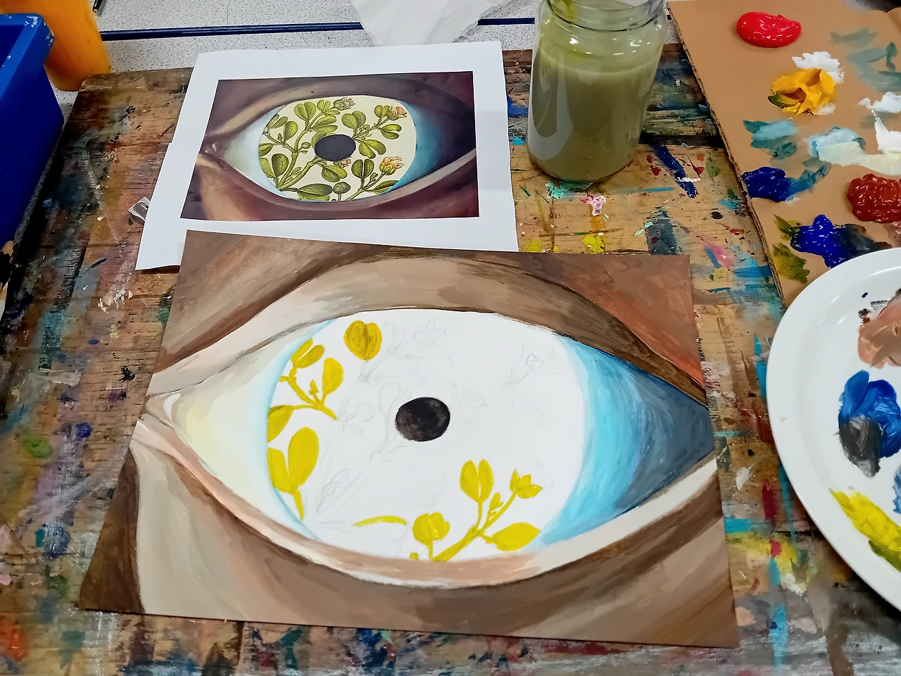 살색 부분을 칠해놓고 그다음에 눈동자 흰자, 그리고 동공, 그다음에 홍채 부분에 꽃을 칠하기 시작했다.