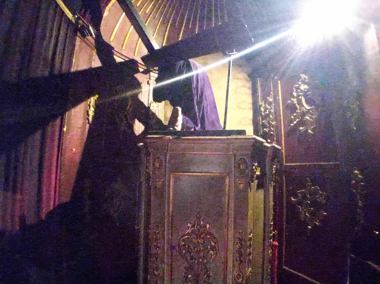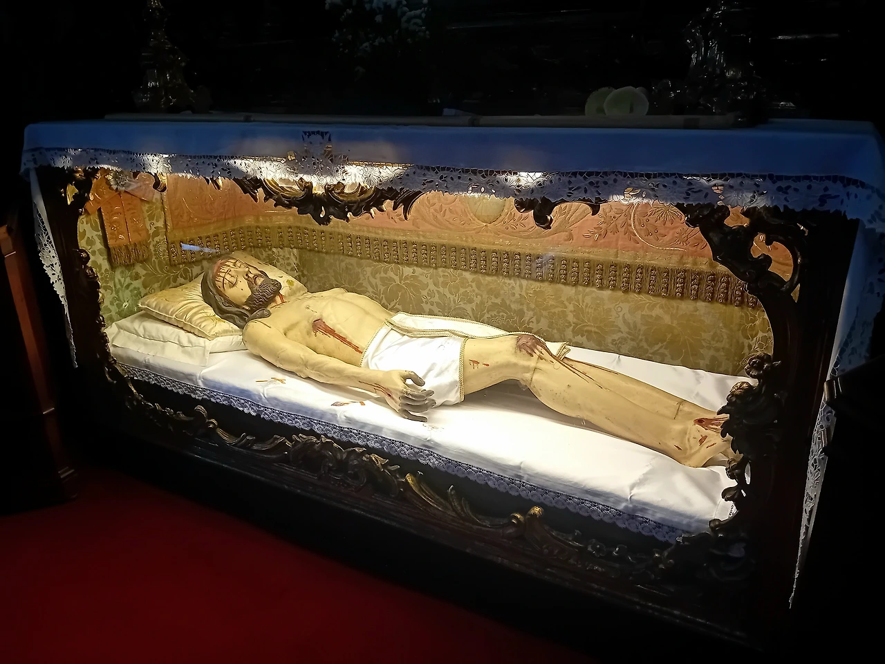 이 성당은 특이하게 돌아가신 예수님이 누워 있는 조각상이 있다.