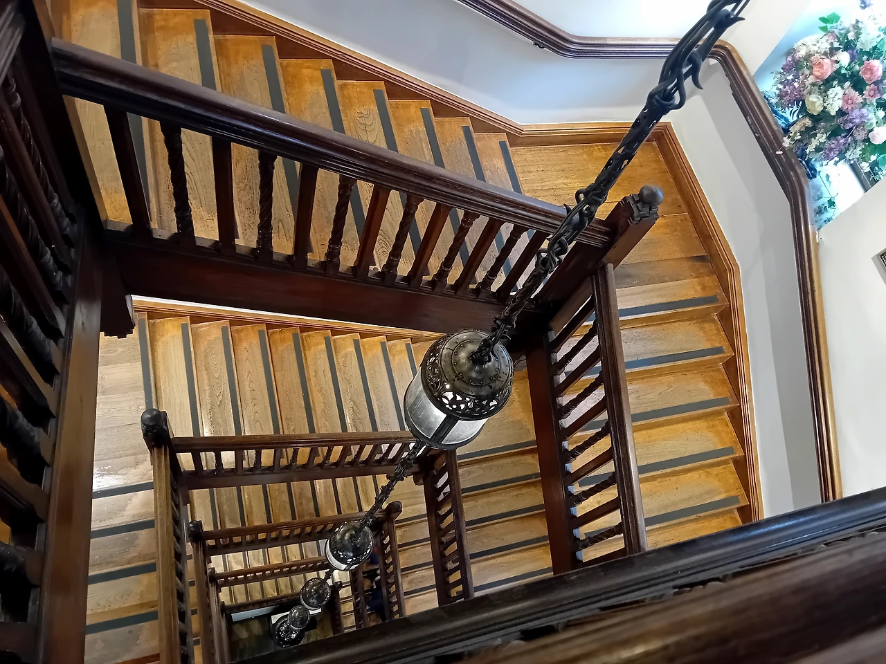 올라갈 때 엘리베이터를 타서 몰랐는데 계단을 내려다보니 목조 계단과 고풍적인 전등들이 되게 운치 있다.