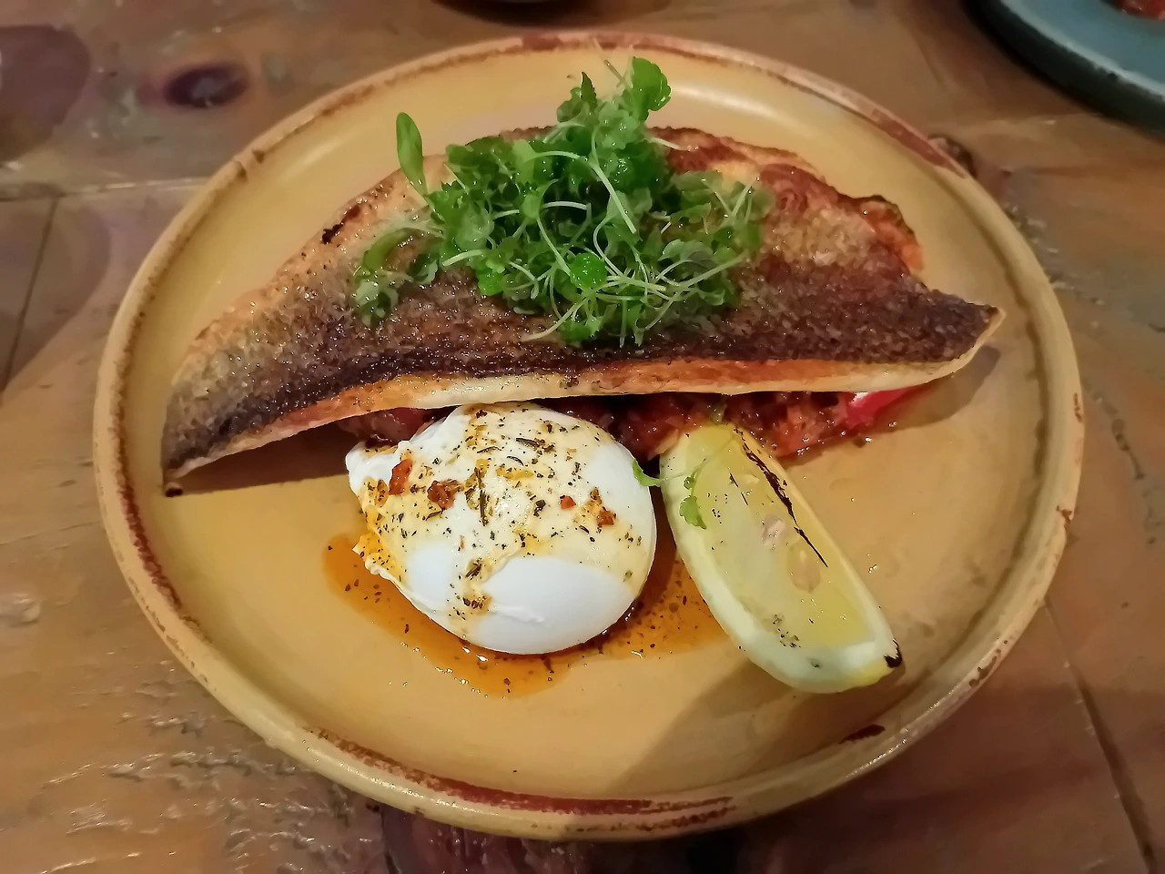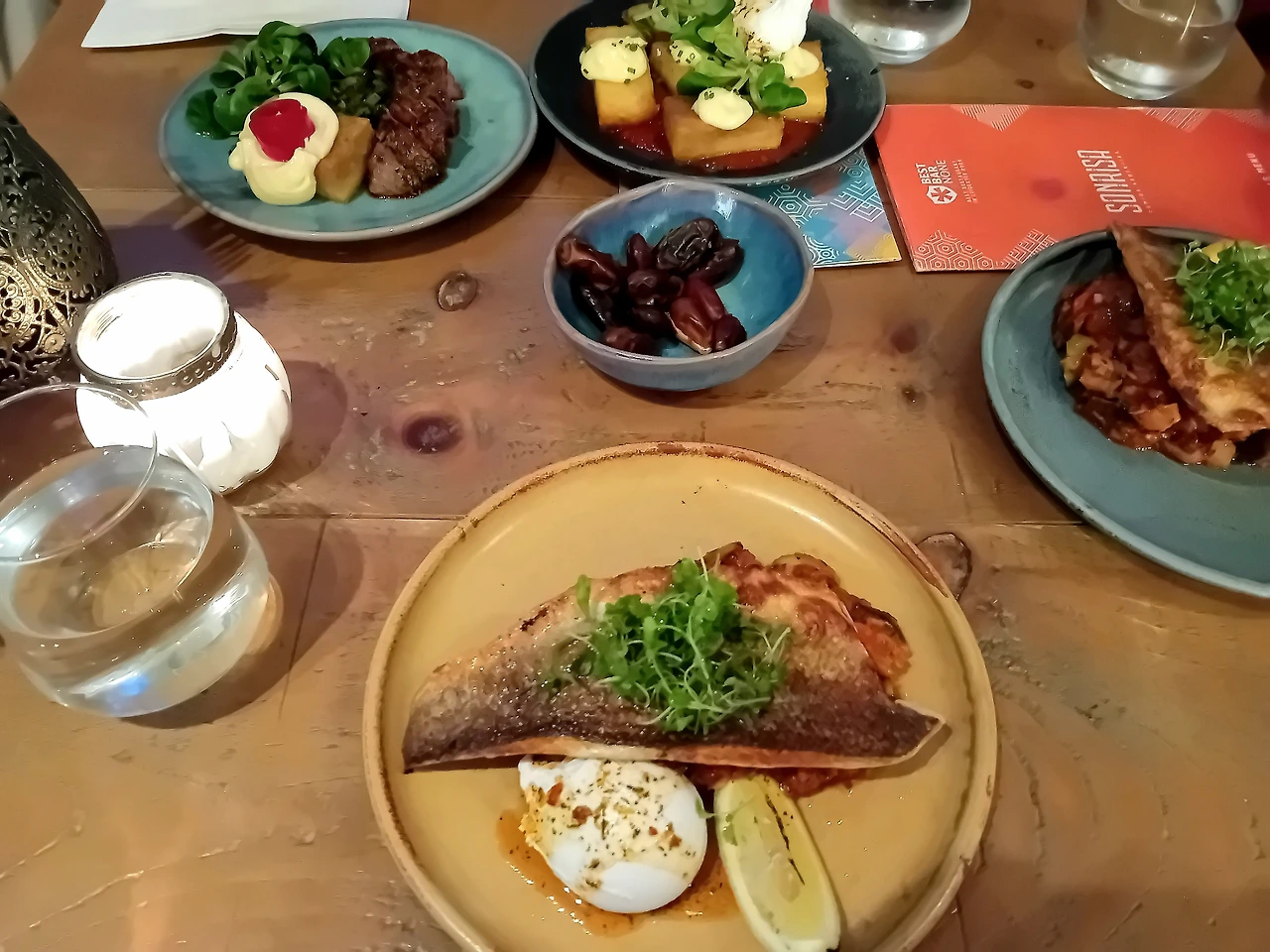 이번에는 농어구이 pan-fried seabass with sofrito de verduros, olives, potatoes and poached egg (£12.90 = 2만 2천 원)를 시켜봤다. 농어구이 밑에 채소 볶음과 감자구이가 있고 수란을 같이 준다. 농어를 아주 잘 구웠다. 비린내가 하나도 없고, 껍질은 바삭하고, 속살은 촉촉하다. 최근 영국에서 먹은 생선구이들 중에 탑인 거 같다. 한국인의 입맛에 잘 맞는 스페인식 양념으로 야채와 감자를 버무린 것도 마음에 들었다. 수란은 왜 굳이 넣었는지 모르겠는데 이런 게 스페인, 지중해식 현대 요리 스타일이란다. 영국에서 이 정도 퀄리티 생선구이 식사에 이 가격이면 진짜 싸고 괜찮은 거 같다.