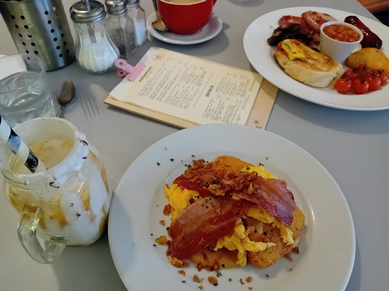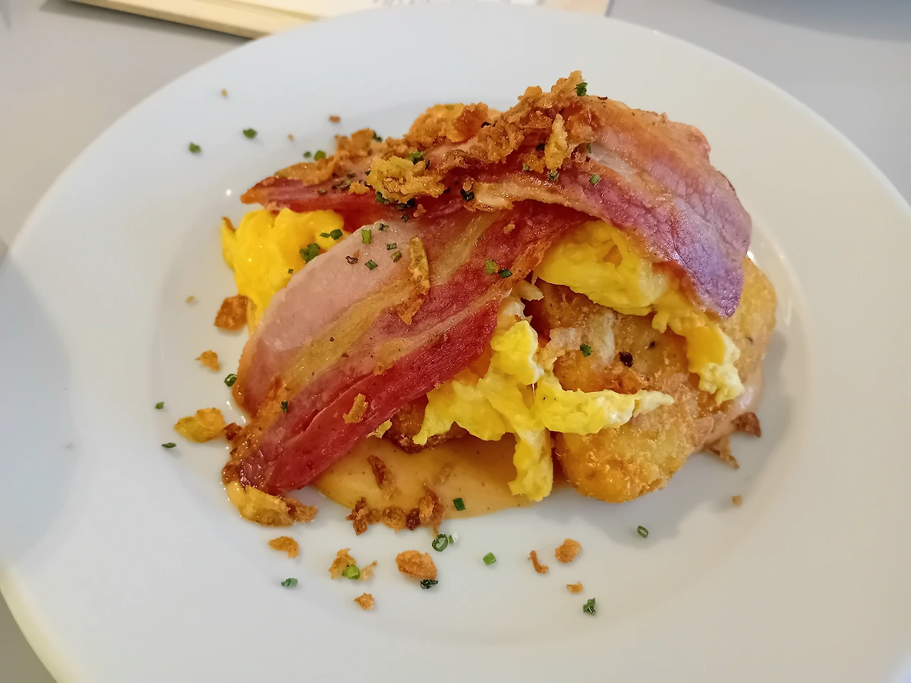 해시포테이토를 시켰더니 해시포테이토 위에 계란 스크램블이랑 베이컨이 올려져 나왔다. 베이컨 돼지 냄새가 너무 심해서 빼고 먹었다.