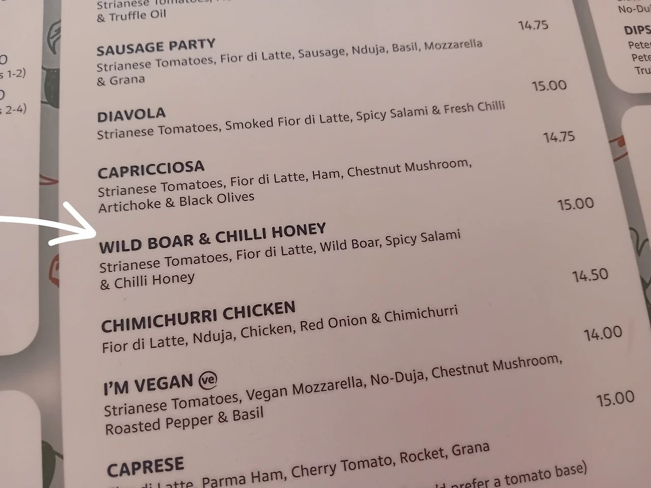 (https://brunch.co.kr/@8df7531fef574a5/254). 야생 멧돼지와 매운 꿀 wild boar & chilli honey피자라니 너무 신기하잖아, 하면서 시켰다.