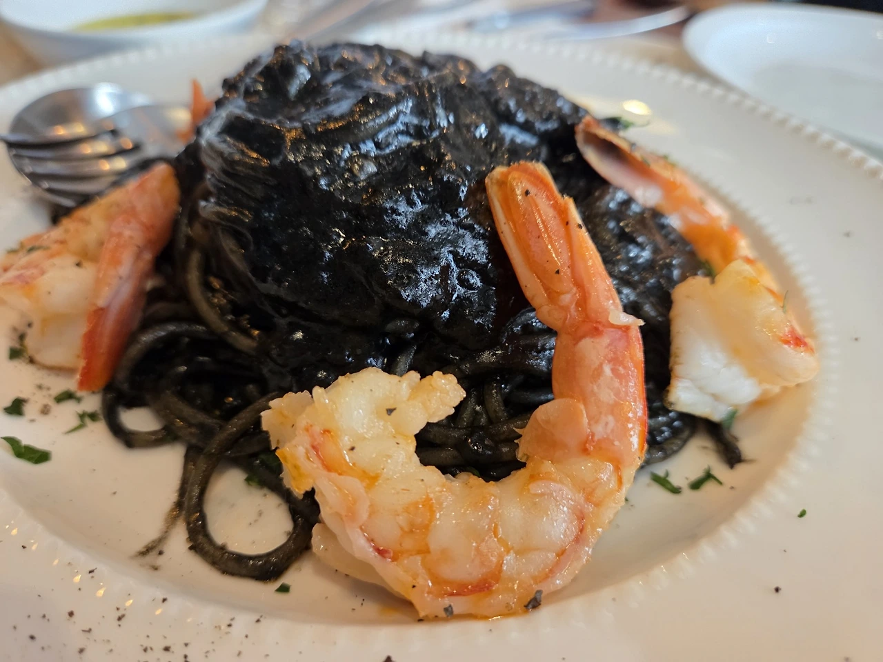 자연산 홍새우구이를 곁들인 먹물 스파게티는 포르투에서 먹었던 것과