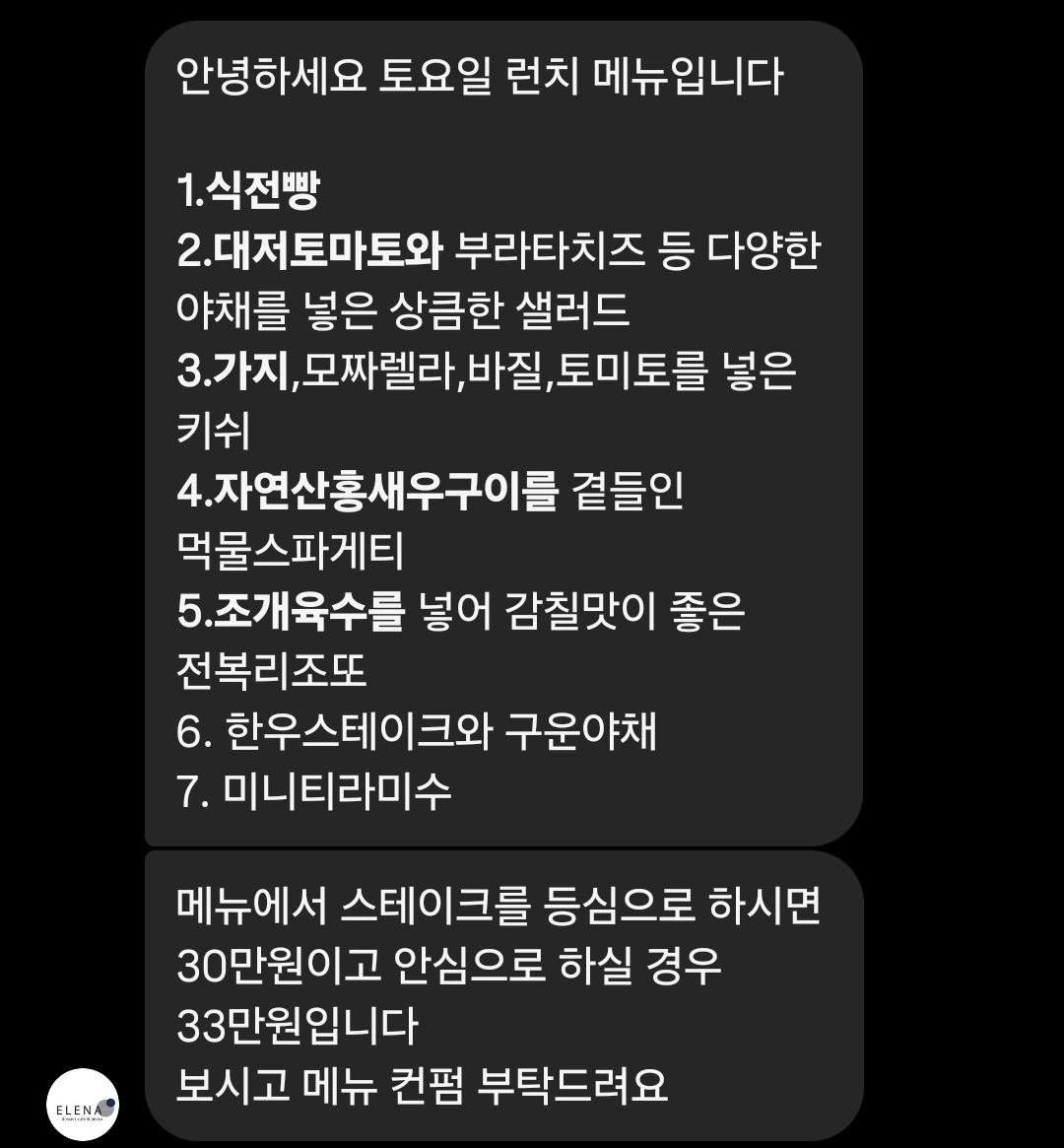 친구들과 같이 청담 가성비 이탈리안 맛집 엘레나영에 다녀왔다. 1인 운영 식당이라 사장님이 혼자 요리하고 서빙하고 다 하신다. 단품으로 먹을 수도 있지만 코스요리도 짜주신다. 우리는 식전빵, 샐러드, 키쉬, 먹물스파게티, 전복리소토, 스테이크, 티라미수를 코스로 먹었다. 이렇게 7개 메뉴 코스로 먹는데 5명이서 30만 원 냈다. 예약은 친구들 중의 한 명(모임의 총무님)이 했고 음식 사진들은 또 다른 친구가 찍은 거다.