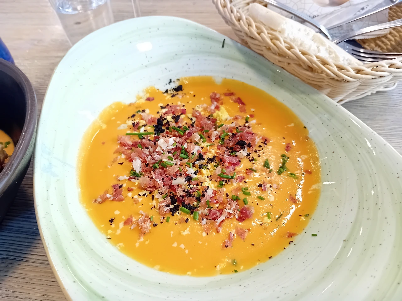 토마토 수프, 가스파초(Gazpacho)도 시켰는데 없다고 토마토 크림, 살모레호(Salmorejo)를 대신 내왔다. 가지튀김에 같이 나온 토마토 크림과 똑같은 거다. 베이컨이랑 파 다진 것 같은 것만 얹혀 나왔다. 다른 걸 시킬 걸 그랬군 후회했지만 이미 늦었다. 토마토 크림은 딱히 내 취향은 아니다.