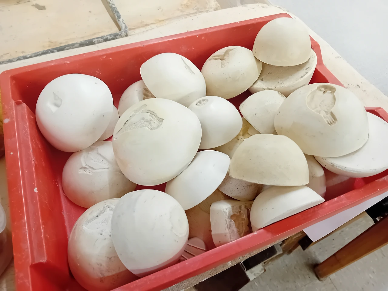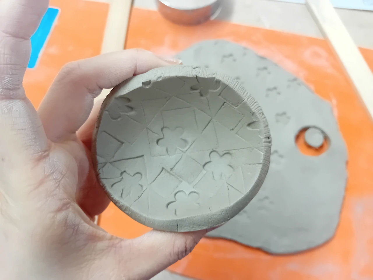 패턴이 예쁘게 잘 나오게끔 동그란 쿠키 커터 같은 걸로 찍어서 잘라내고서 험프 몰드 hump mould를 써서 작은 그릇 (간장 종지 사이즈) 모양을 잡았다.