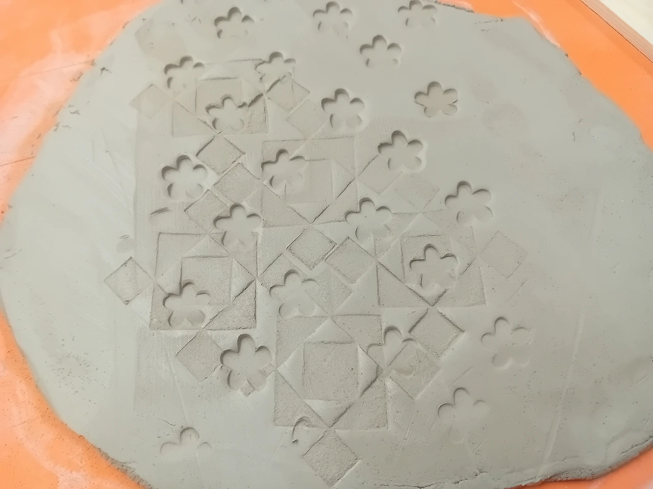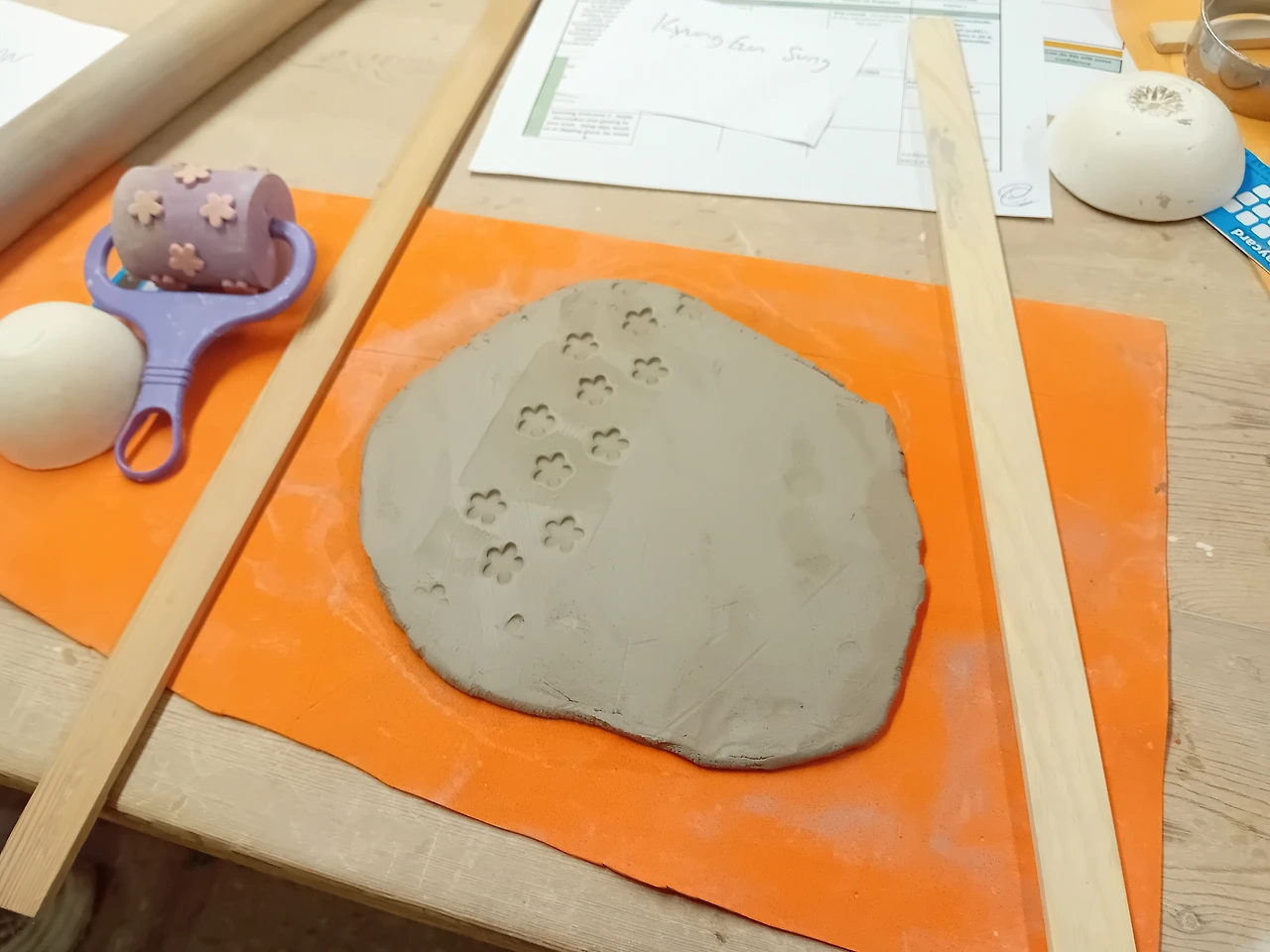 쿠키 만들 때 밀가루 반죽 도우 dough를 납작하게 만드는 것과 같이, 롤링핀 rolling pin을 써서 찰흙을 납작하게 폈다. 바닥에는 얇은 고무판 같은 것을 깔았다. 찰흙 두께를 일정하게 하기 위해 높이가 같은 나무판 두 개를 양 옆에 놓고 그 뒤에서 롤링핀을 굴렸다. 다양한 패턴의 스탬프들과 롤러들이 있는데 일단 나는 꽃을 찍어봤다.