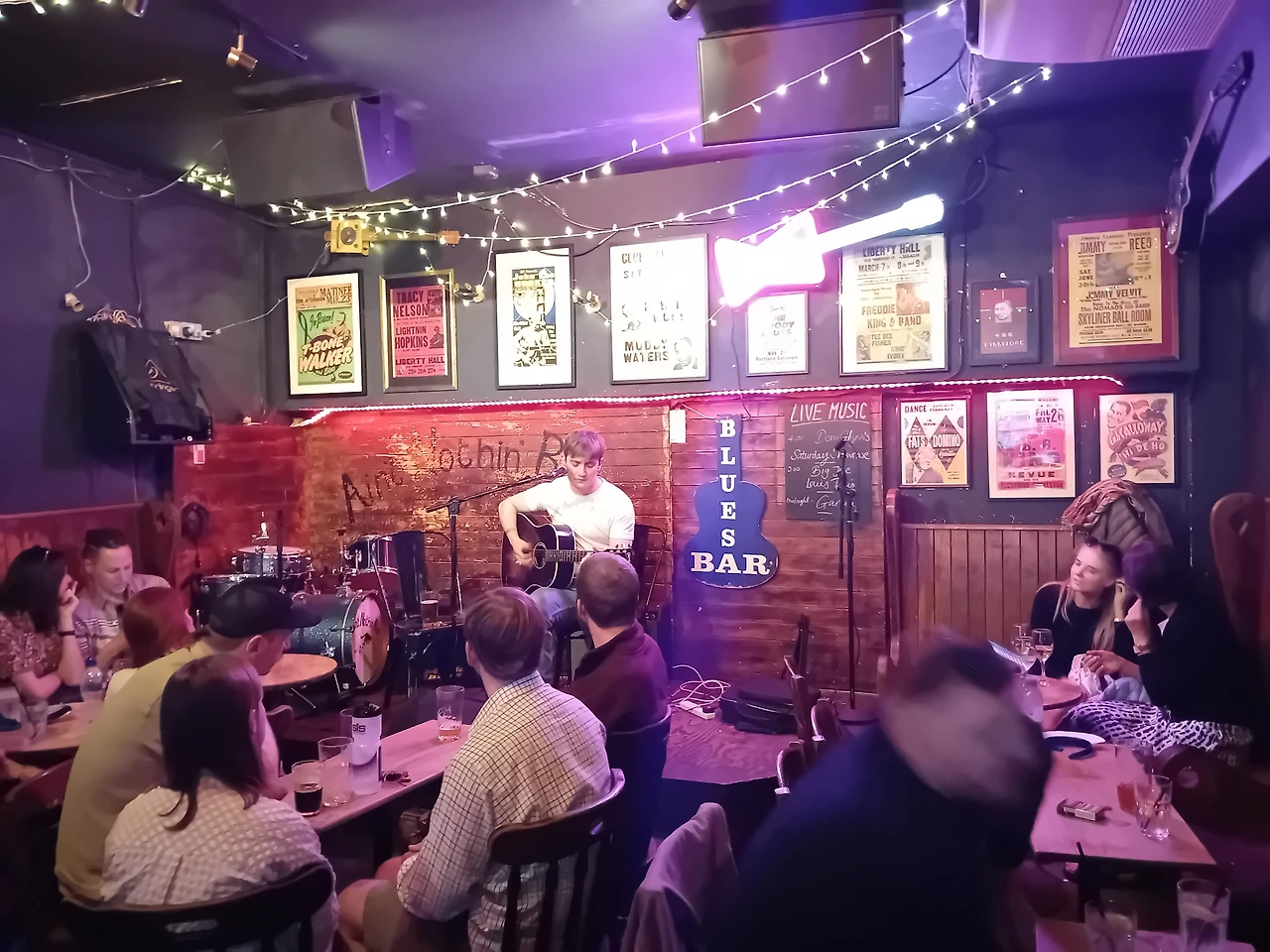 한 30분쯤 서있으니까 솔로 공연이 끝나고 잠시 쉬는 시간에 무대 앞 가운데 테이블 자리가 났다. 앉아서 좀 기다리니 아까 솔로 공연하던 사람이 밴드 공연을 한다. 블루스바인데 음악은 컨추리풍이다.