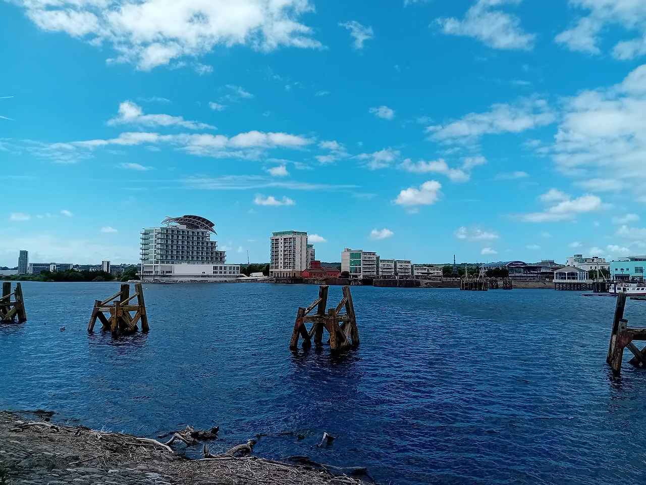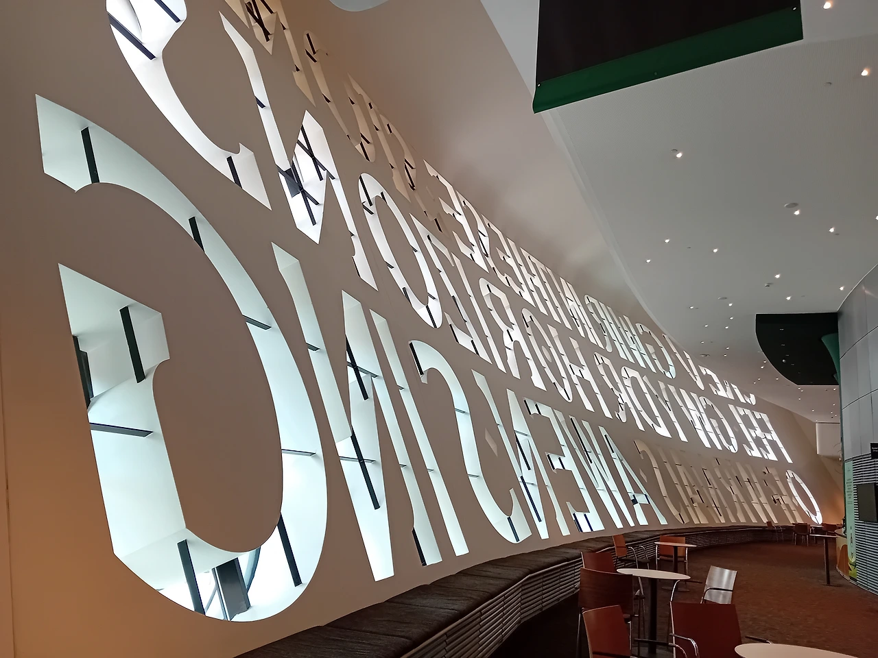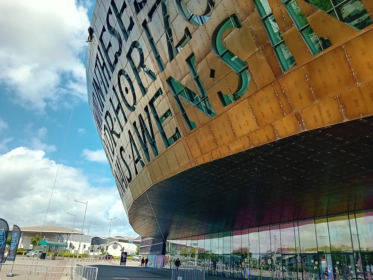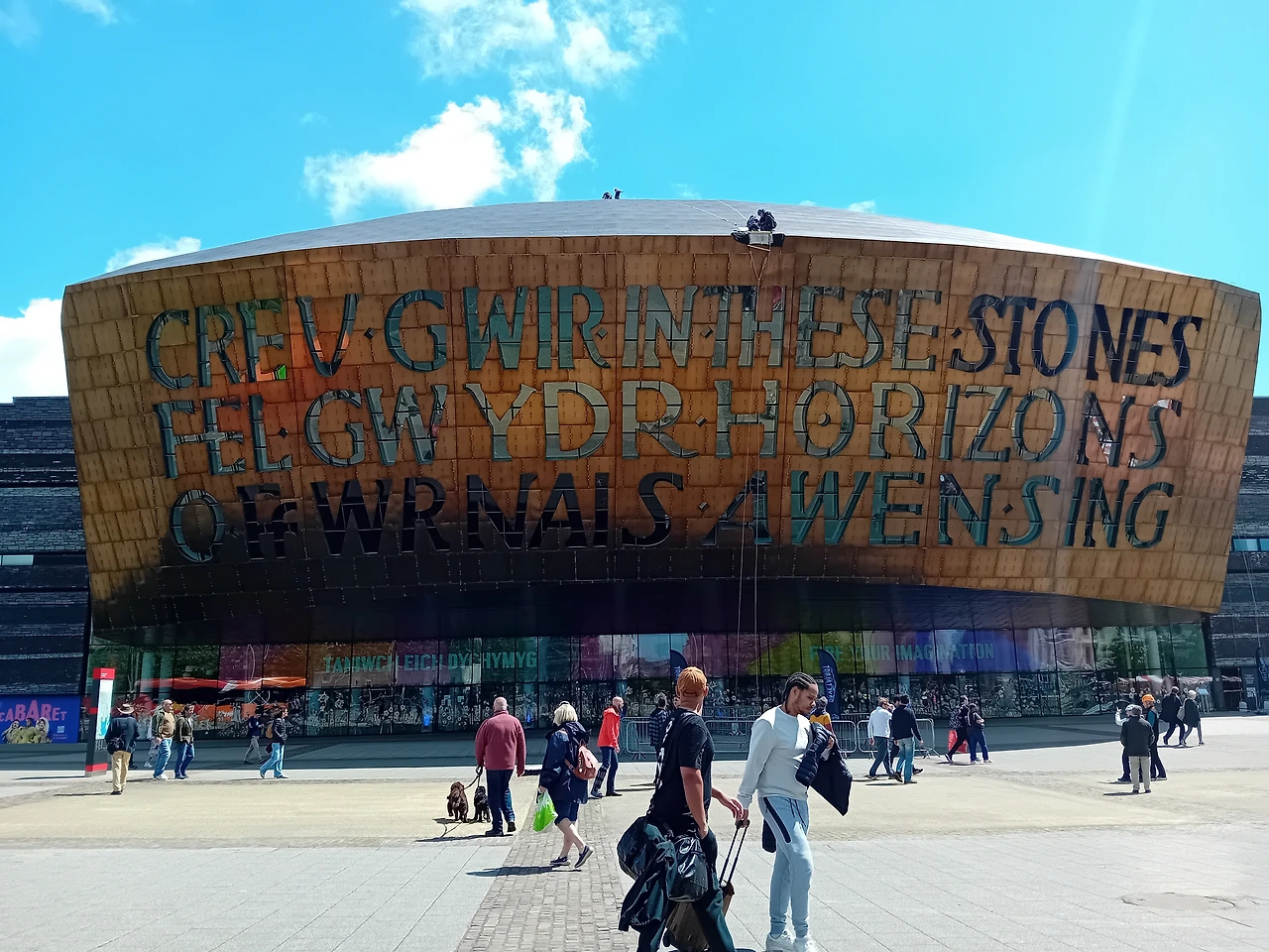 버스 타고 카디프 베이에 도착하니 제일 먼저 보이는 것은 웨일스 밀레니엄 센터 Wales Millennium Centre (공연 예술 복합 문화센터)다. 건물 정면에 쓰여있는 것은 웨일스어로 CREU GWIR FEL GWYDR O FfWRNAIS AWEN. 직역하면 "영감의 용광로에서 유리처럼 진실을 창조하다"로, 시적 영감과 창조의 과정을 뜻한다 한다. 영어 문구는 IN THESE STONES HORIZONS SING, 이 돌들 속에서 지평선이 노래한다로, 건물 내부에서 울려 퍼지는 음악과 예술을 표현한 것이라 한다. 멋짐이 과도하다.