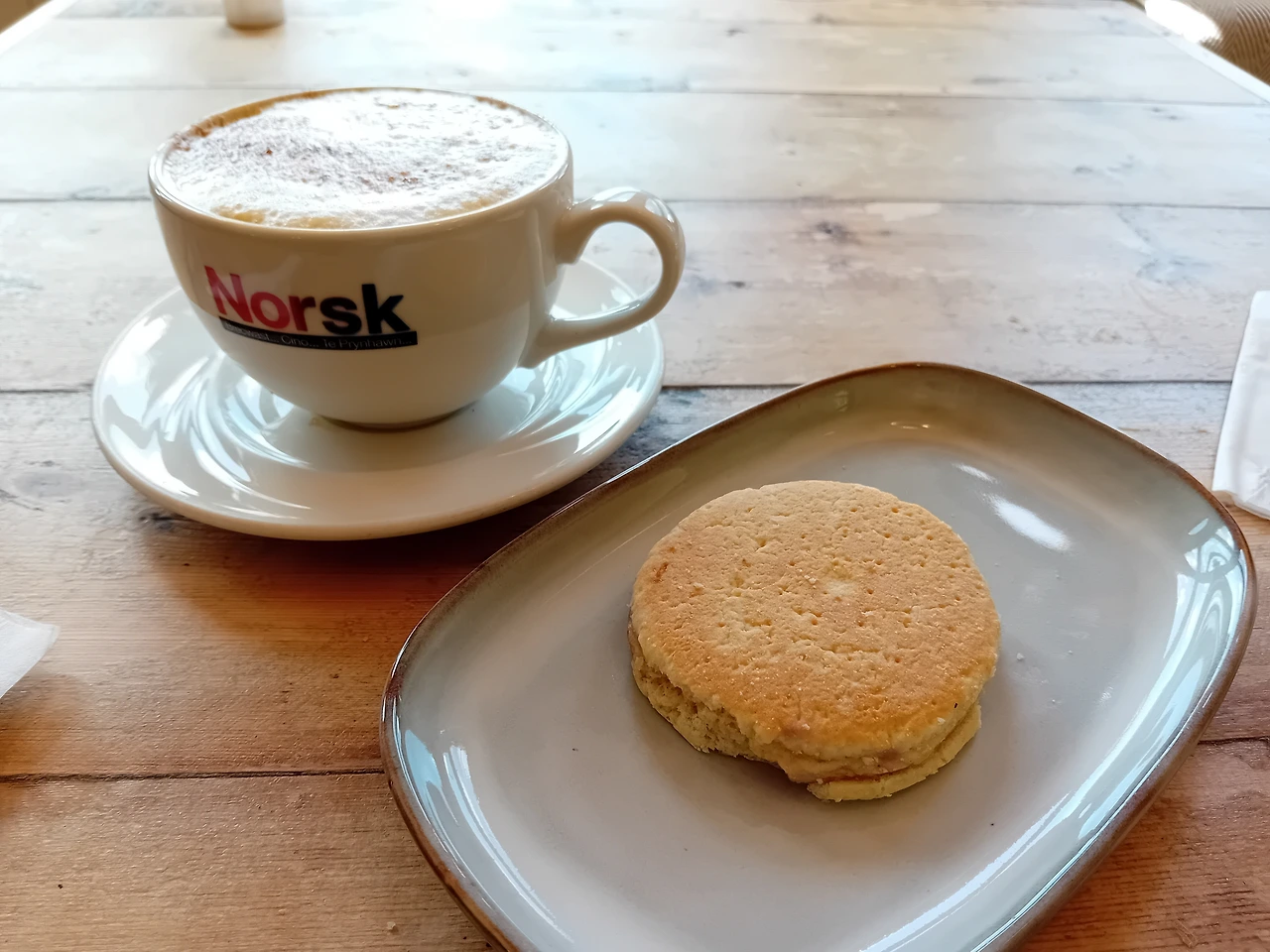 들어가보니 아트센터는 위층에 아주 쪼꼬맣게 있고 주는 1층에 카페 겸 식당이다. 들어온 김에 웰시 케이크 Welsh cake랑 커피를 시켰다. 웰시 케이크는 스콘을 납작하고 더 단단하게 구워서 가운데 잼만 넣은 맛이다. 나는 그냥 스콘에 잼이랑 크림을 바르는 게 더 맛있는 거 같다.
