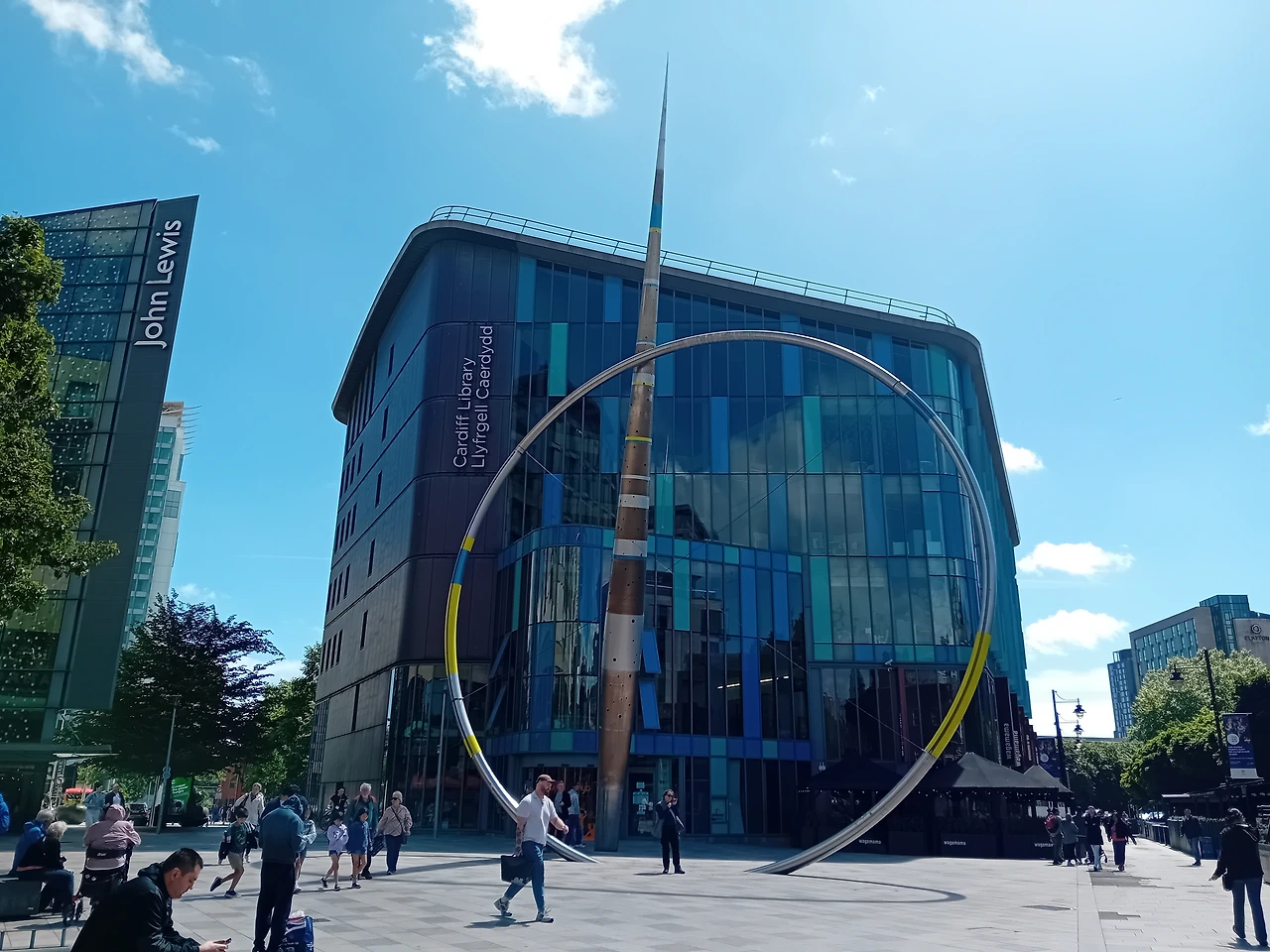 카디프 베이 Cardiff Bay(카디프만) 기차역으로 가려고 시내 기차역에서 왕복표를 끊었는데, 오늘 그쪽 기차가 안 다녀서 대체 버스를 타야 했다. 버스역 가는 길에 도서관을 지나가는데, 그 앞 광장의 구조물이 멋지다. 어디까지 제작을 해와서 어떻게 조립을 한 걸까 궁금해진다. 야광이라 밤에는 빛이 난다고 한다.