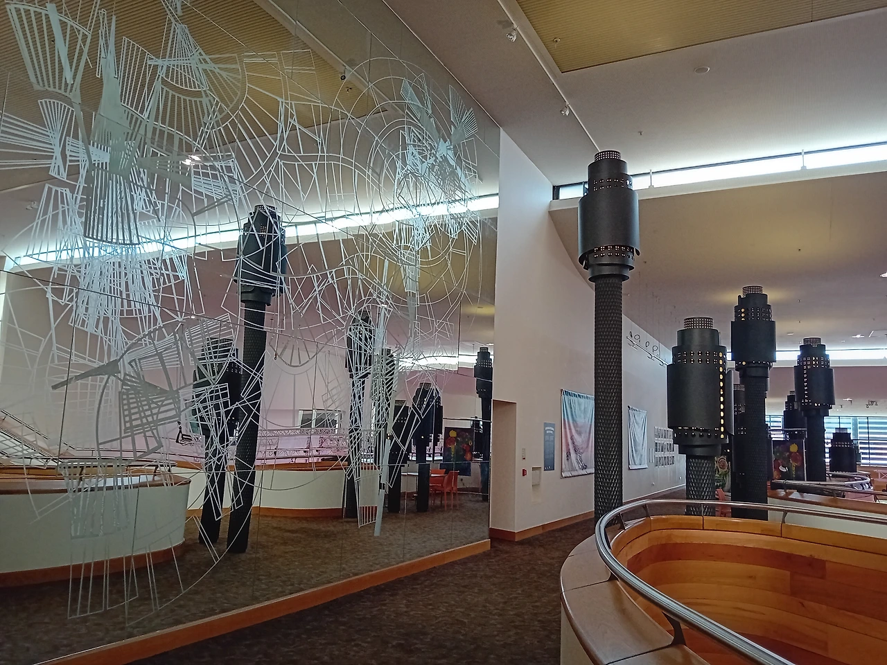 3층에 올라가면 벽 한 면이 다 거울이고 1층에서 시작한 기둥의 끝들이 들쭉날쭉 있다. 신기한 구조다.