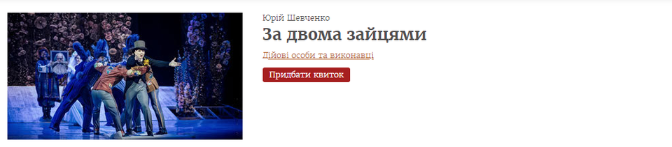그때 내가 본 발레는 '두 마리 토끼를 쫒다.'라는 작품이다. 이 작품은 1961년 소련 우크라이나 시절 엄청난 흥행을 했던 영화를 모티브로 재창조한 발레 작품이다. 다른 유명한 발레도 많지만 (호두까기 인형, 백조의 호수 등) 이왕 우크라이나에 왔으니 우크라이나 고유의 발레 작품을 보는 것이 의미 있겠다고 생각해서 이 작품을 선택하였다.