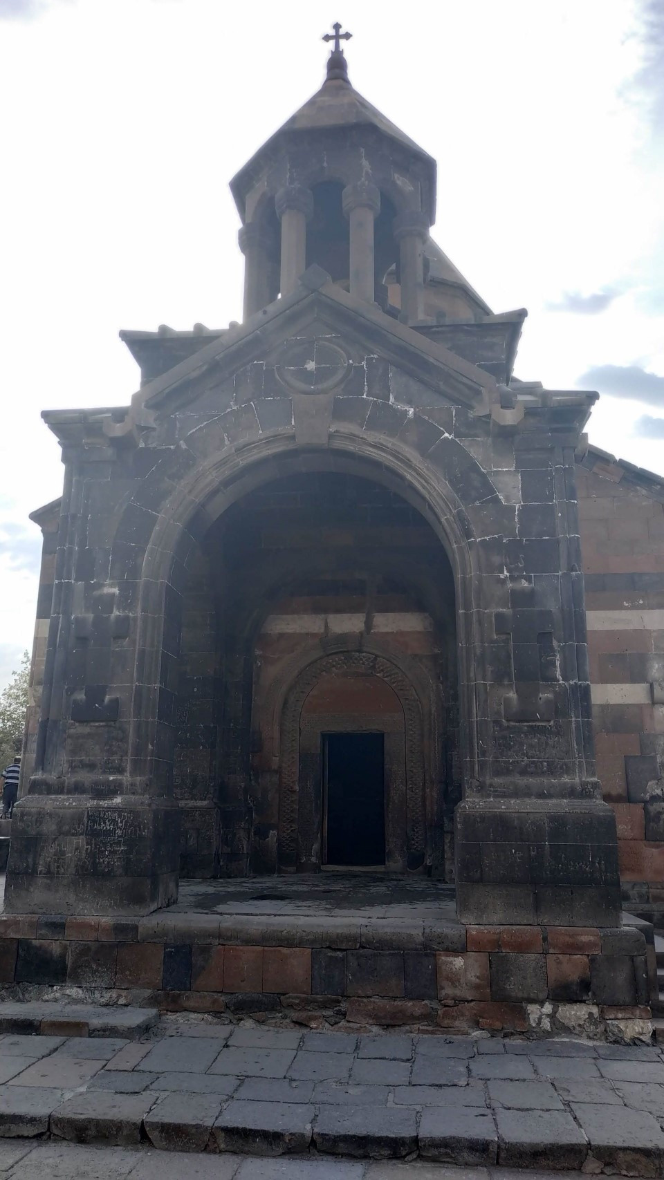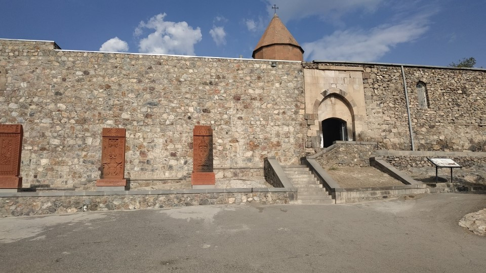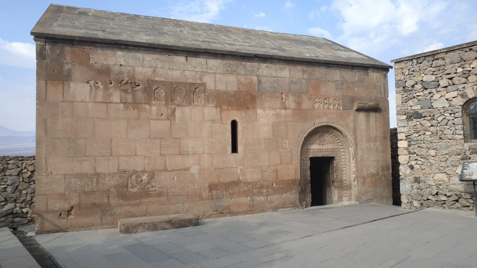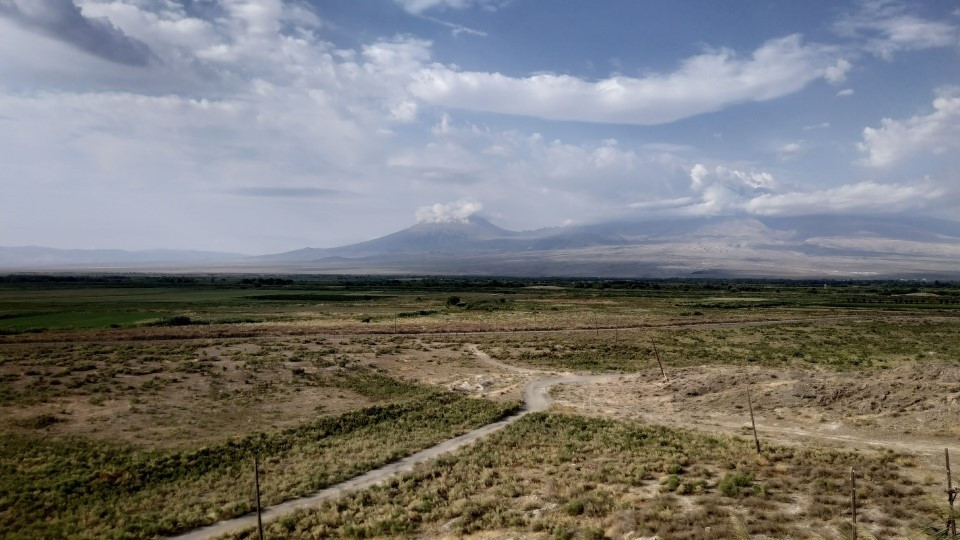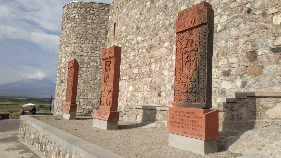 수도원 입구 들어가기 전 고개를 돌려보니 저 멀리 아라라트산이 보였다. 아라라트산은 아르메니아인들의 영산이다. 아르메니아인들은 과거 오스만제국의 대학살 때 전 세계로 뿔뿔이 흩어졌는데 해외로 도망간 아르메니아 인들이 고국을 그리며 항상 아라라트 산을 생각했다고 한다. 성경 창세기의 노아의 방주가 대홍수 이후에 아라라트 기슭에 도착했다고 한다. 그러니까 성경에 따르면 이곳은 인류가 다시 시작한 곳이 되겠다. 아르메니아인들에게는 아쉽게도 이곳은 지금 이곳은 튀르키예의 영토이다. 과거 수차례 영토 분쟁이 있었고 현재 튀르키예 공화국의 전신 오스만제국과 당시 소련의 전신이었던 러시아 제국이 맺은 조약 이후로 쭉 튀르키예의 영토로 남아있다. 비록 지금 아르메니아의 땅은 아니지만 아르메니아 국민들의 아라라트산 사랑은 각별하디. 관공서 민간 할 것 없이 아라라트산의 문양을 새겨놓은 그림들을 아르메니아 국내에서 쉽게 볼 수 있다.
