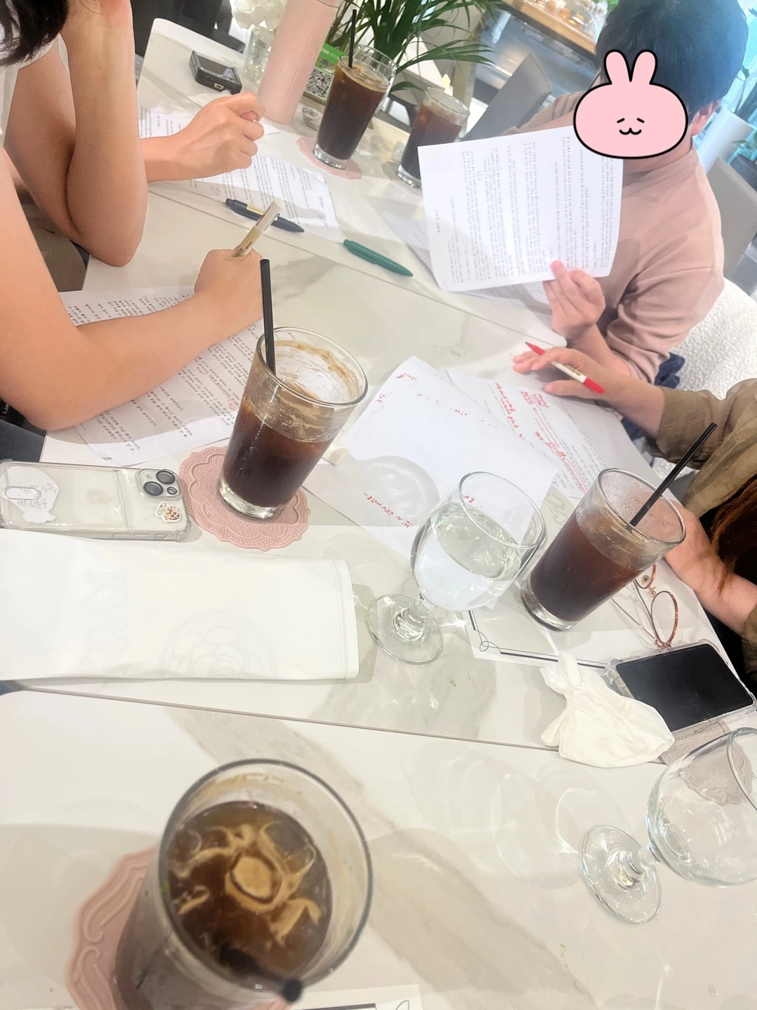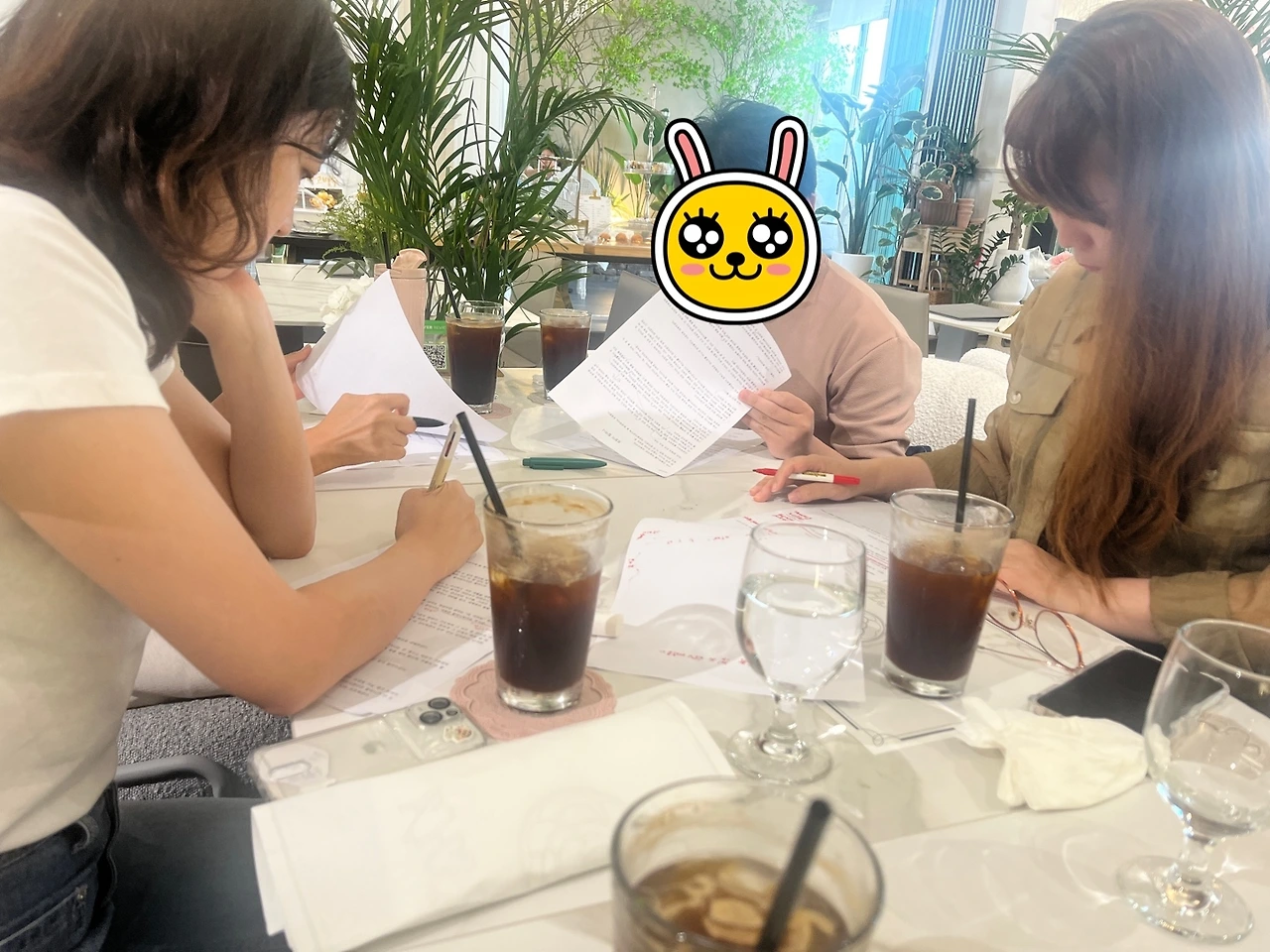 그렇게 무더운 일요일 낮 1시, 한 브런치 카페에서 우리는 만났다. 모두가 한자리에 모였을 때 천천히 둘러봤다. 얼굴에 흘린 땀을 냅킨으로 닦아가며 인사하시던 우기 작가님과, 밝은 브라운 톤의 긴 머리를 소녀처럼 늘어뜨렸지만 빛나는 총명한 눈빛이 예사롭지 않던 미야 작가님이 먼저 눈에 들어왔다. 그리고 밝게 웃고 계시던 빛나는 작가님과 지적인 느낌의 유연 작가님이 계셨다.
