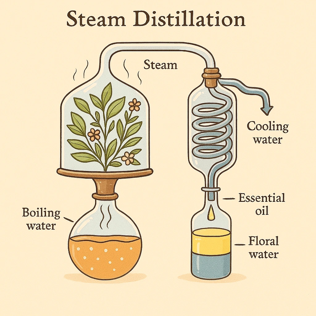 식물에 증기를 통과시켜, 향기 성분을 추출한다.