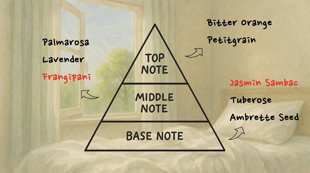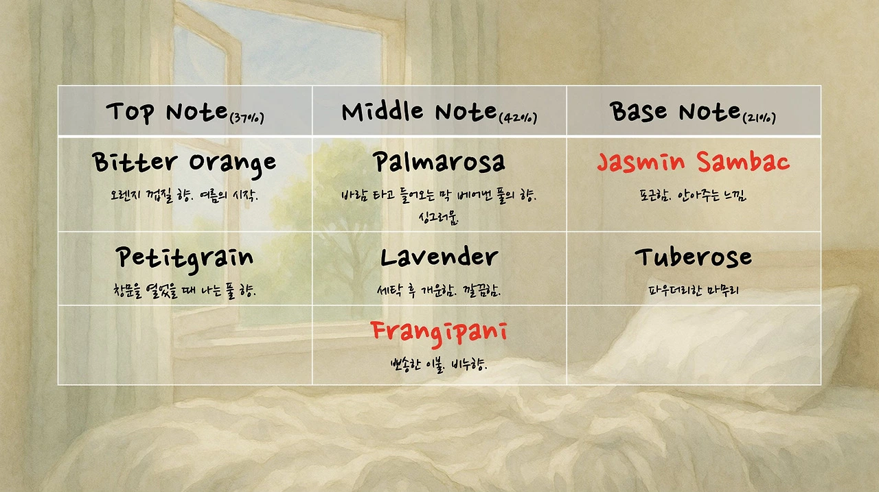 베이스 노트로는 자스민 삼박과 튜베로즈로