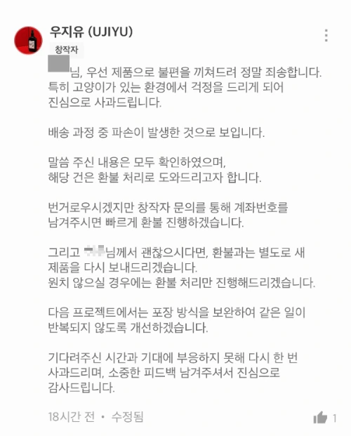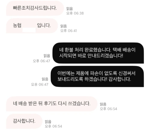 파손되지 않도록 신경 써 새 제품을 재발송했다.