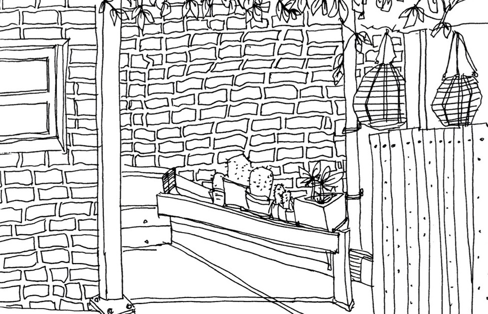 그림은 내가 앉아있던 장소에서 바로 카페로 다시 들어가는 문을 바라보면 보이는 장소를 그렸고