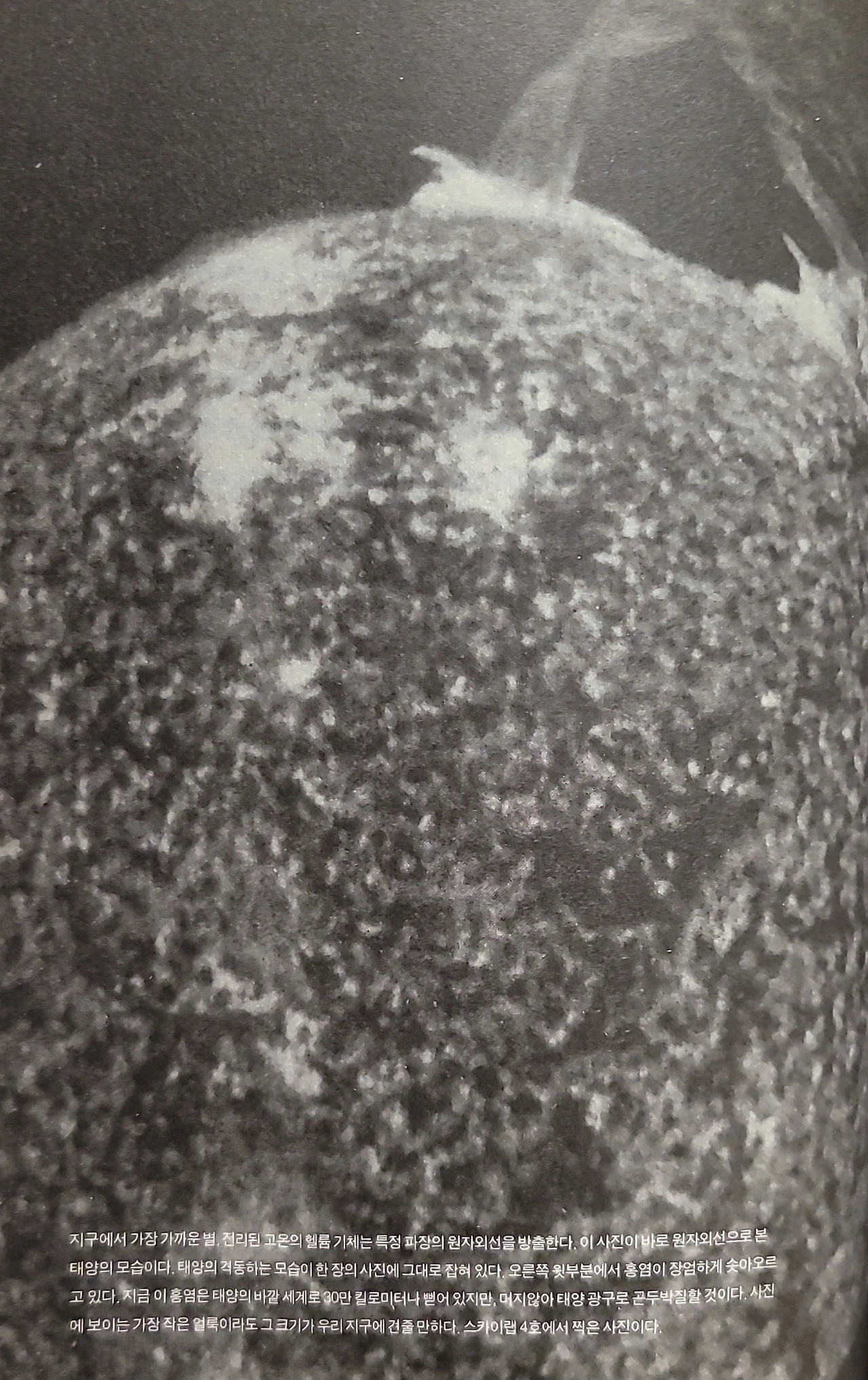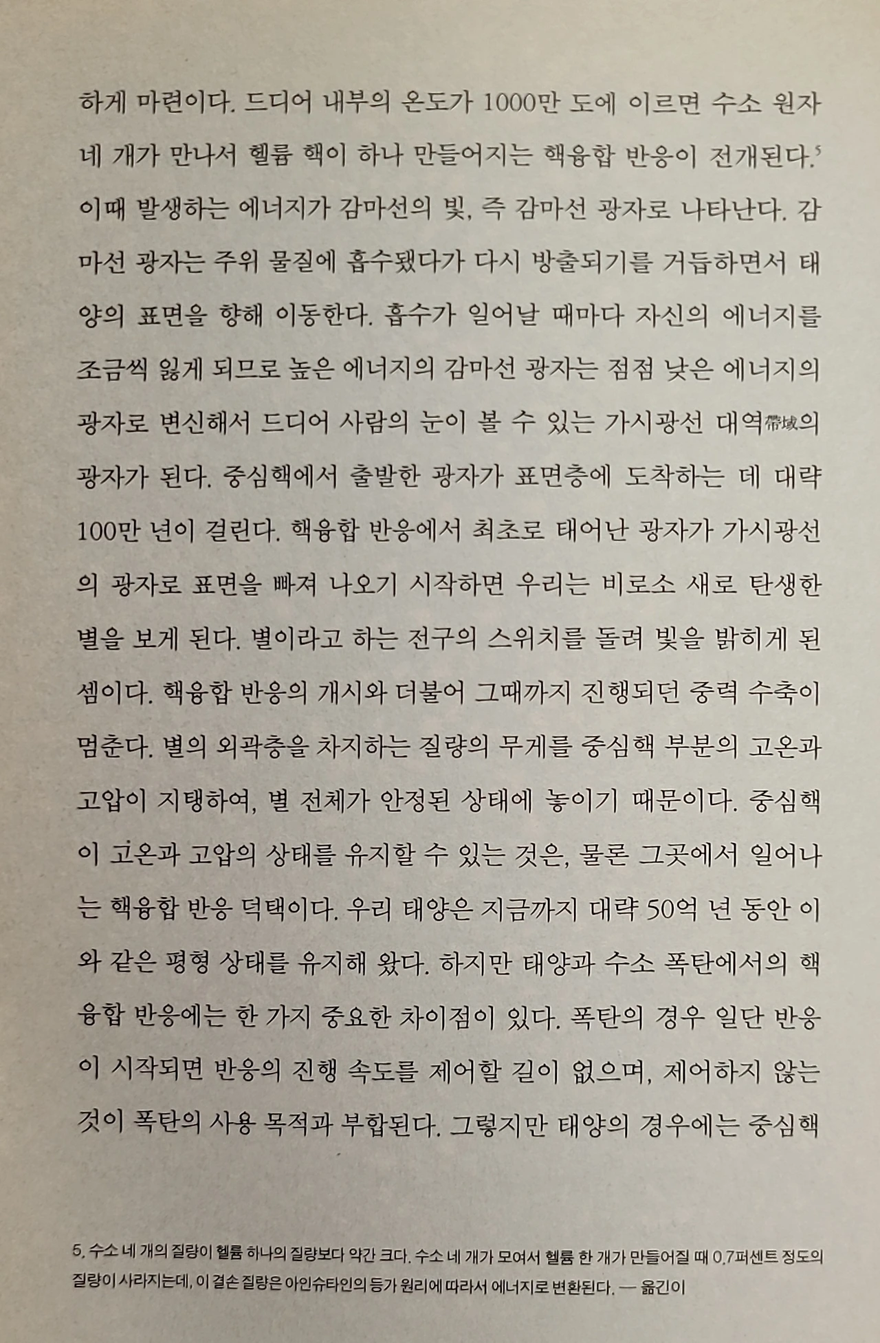 일부 별은 초신성 폭발이라는 작렬한 죽음을 맞이한다. 폭발의 충격파는 주위의 성간 물질을 밀어 성간운의 밀도를 증가시키고 이로 인해 중력 수축이 일어나 별의 탄생을 촉발시킨다. 칼세이건은 이를 두고 별도 인간처럼 부모가 있고 세대가 있다고 말한 부분이 인상 깊었다. 지금 우리에게 낮을 선사하는 태양은 수소를 융합하여 헬륨을 만드는 핵융합 반응을 하고 있다. 이때 발생하는 광자는 중심핵에서 표면층까지 도달하는데 100만 년이 걸린다고 한다. 100만 년 전 호모에렉투스 가족이 살고 있을 때 그들 머리 위 태양에서 만들어진 광자가 지금 내가 사는 지구를 밝히고 있다는 사실이 놀랍다.
