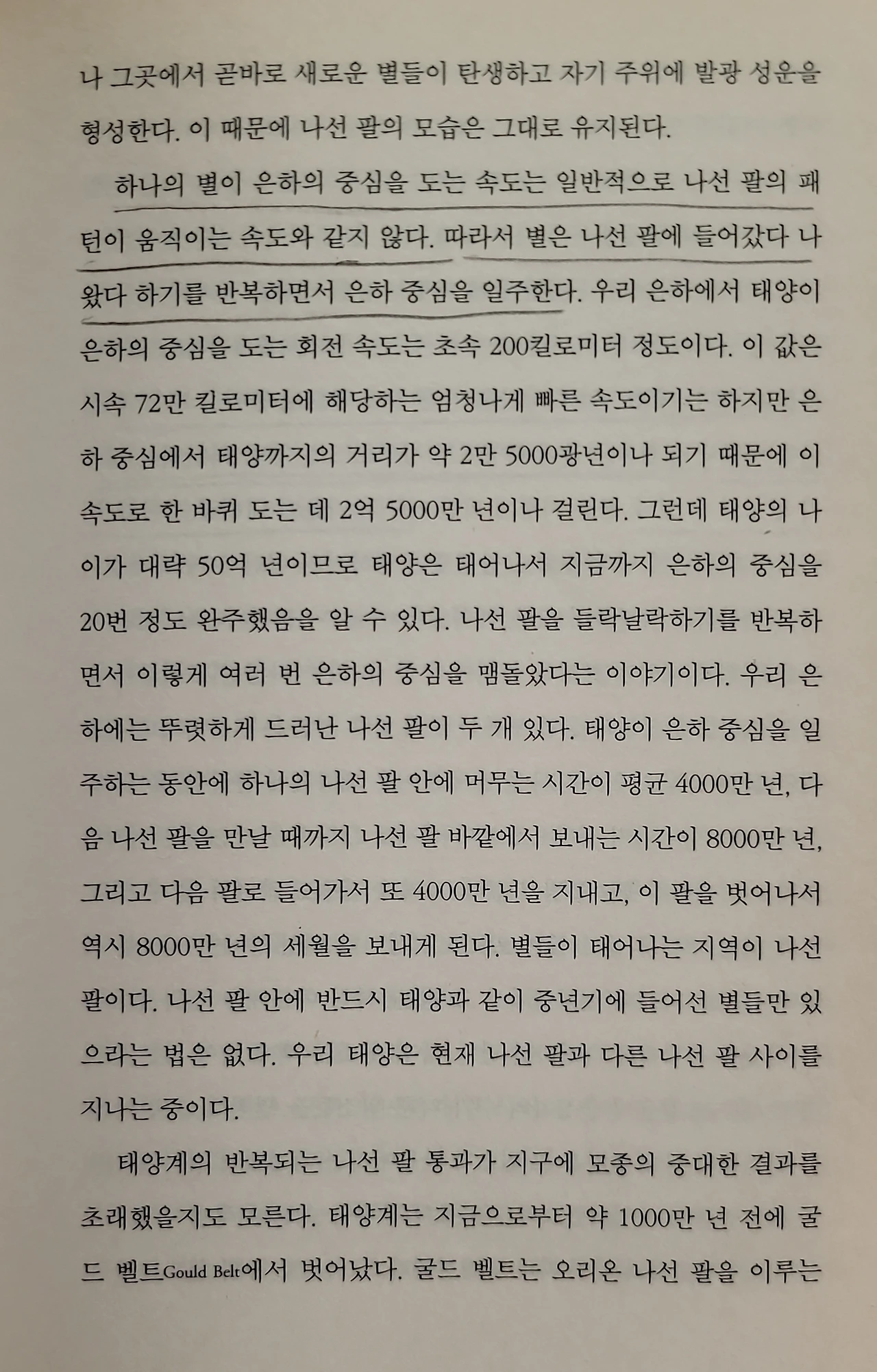 한 나선 팔에서 4000만 년 정도 머물다가 벗어나고 나선 팔 바깥에서 8000만 년의 세월을 보낸 뒤 다음 나선 팔 속으로 들어가는 식이다.
