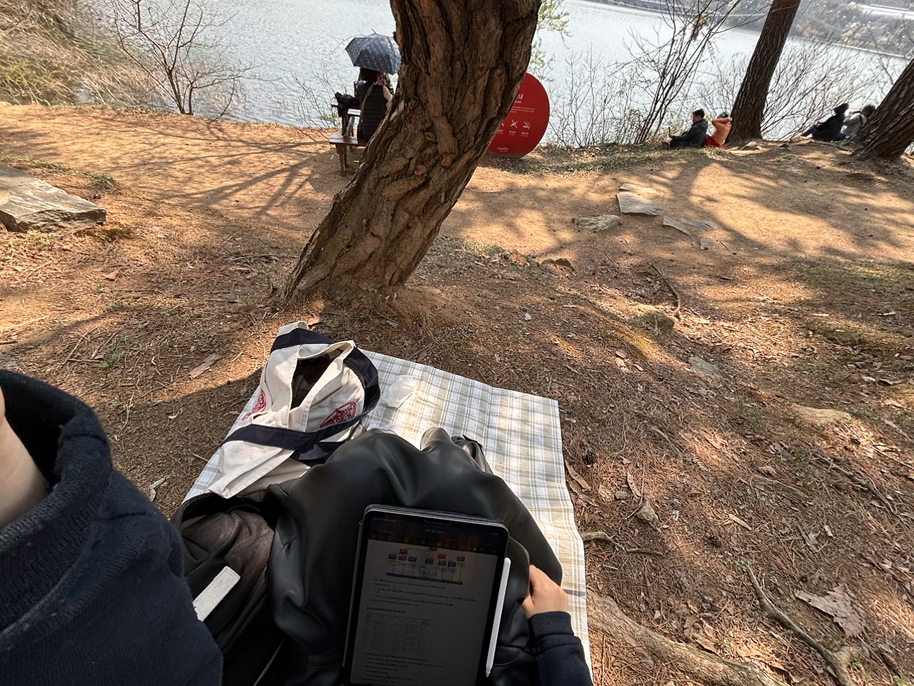 가끔 생각이 많아질 때면 한강 앞에 돗자리를 펴고 앉아 생각을 정리하기도 하고, 시험공부에 지칠 때는 돗자리에 앉아 공부를 하기도 했다. (공부 효율은 별로지만 기분은 좋아졌다.) 혼자만의 시간을 즐기게 되면서부터는 주변에 있는 무리 지어 놀러 온 사람들은 전혀 신경 쓰지 않게 되었다.