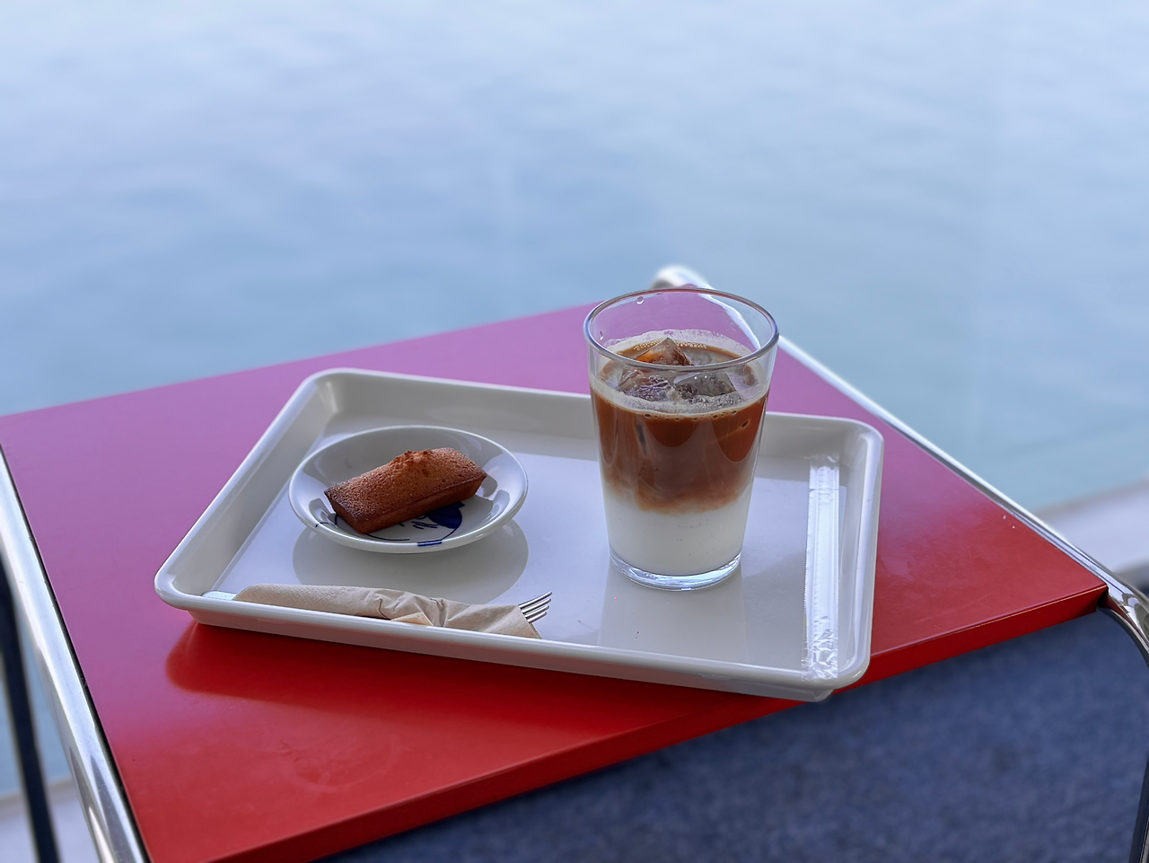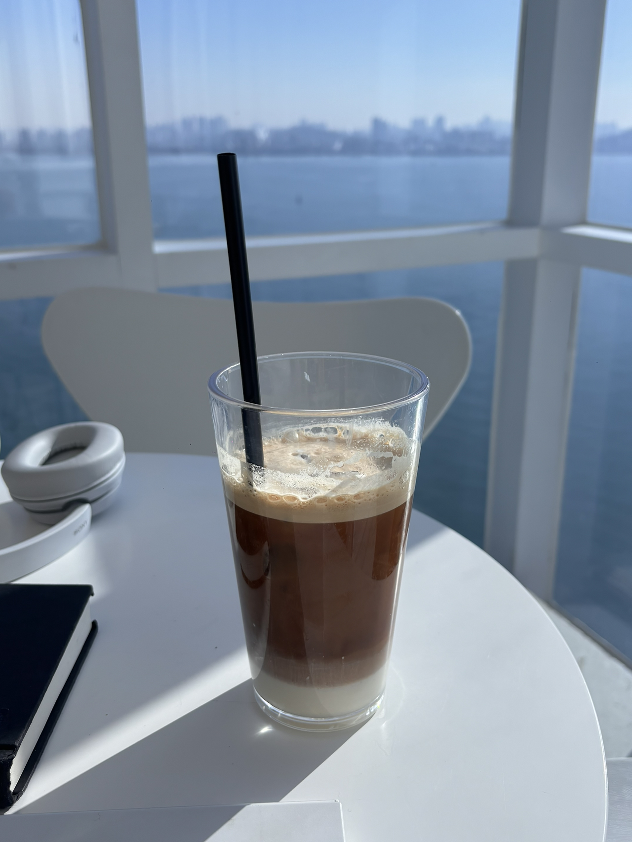 숙소 체크인까지 시간이 조금 남아서 오션뷰 카페에 가기로 했다. 날씨가 약간 흐려서 조금 아쉽긴 했지만 통창 앞에 앉아 바다를 볼 수 있음에 감사했다.