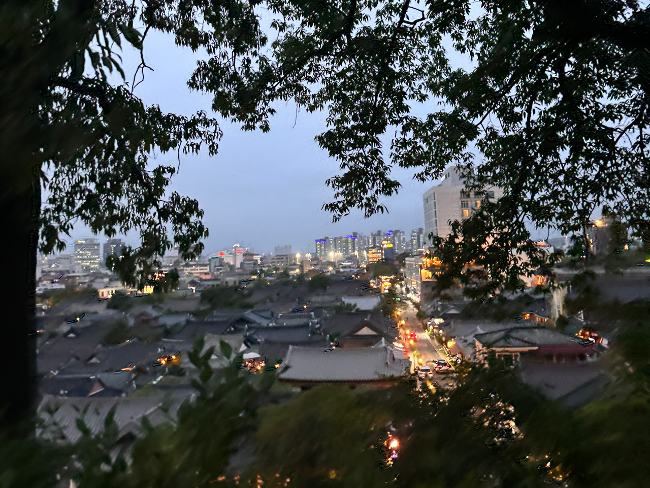 하지만 앞에서도 이야기했듯, 이날 날씨는 그렇게 맑지 않았다. 해가 어느 방향에 있는지 조차 알 수 없을 정도로 구름으로 가득한 하늘이어서 노을은 전혀 보지 못했다. 그치만 한옥마을이 한눈에 내려다보이는 곳에 올라 풍경을 보는 것만으로도 행복했다.